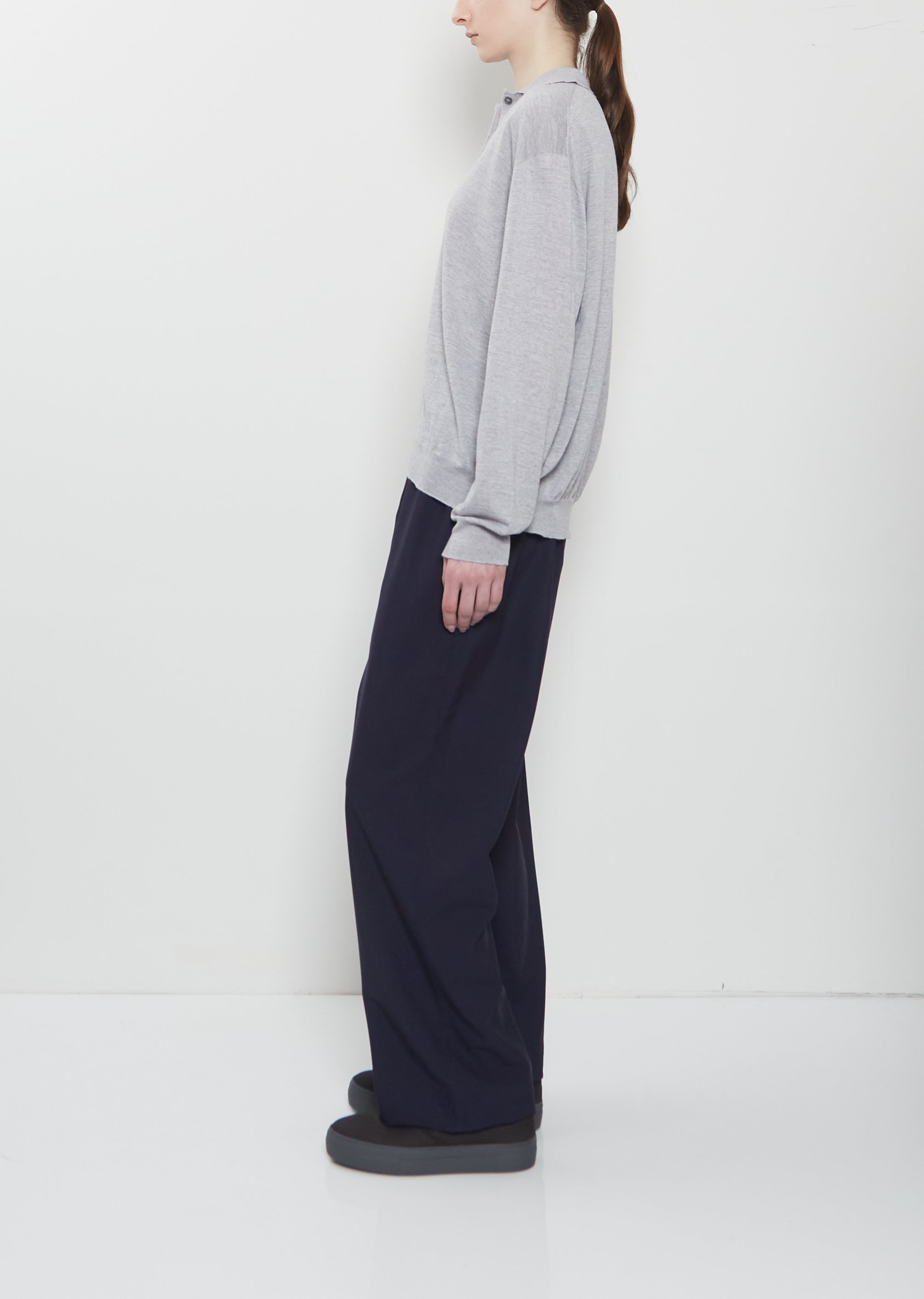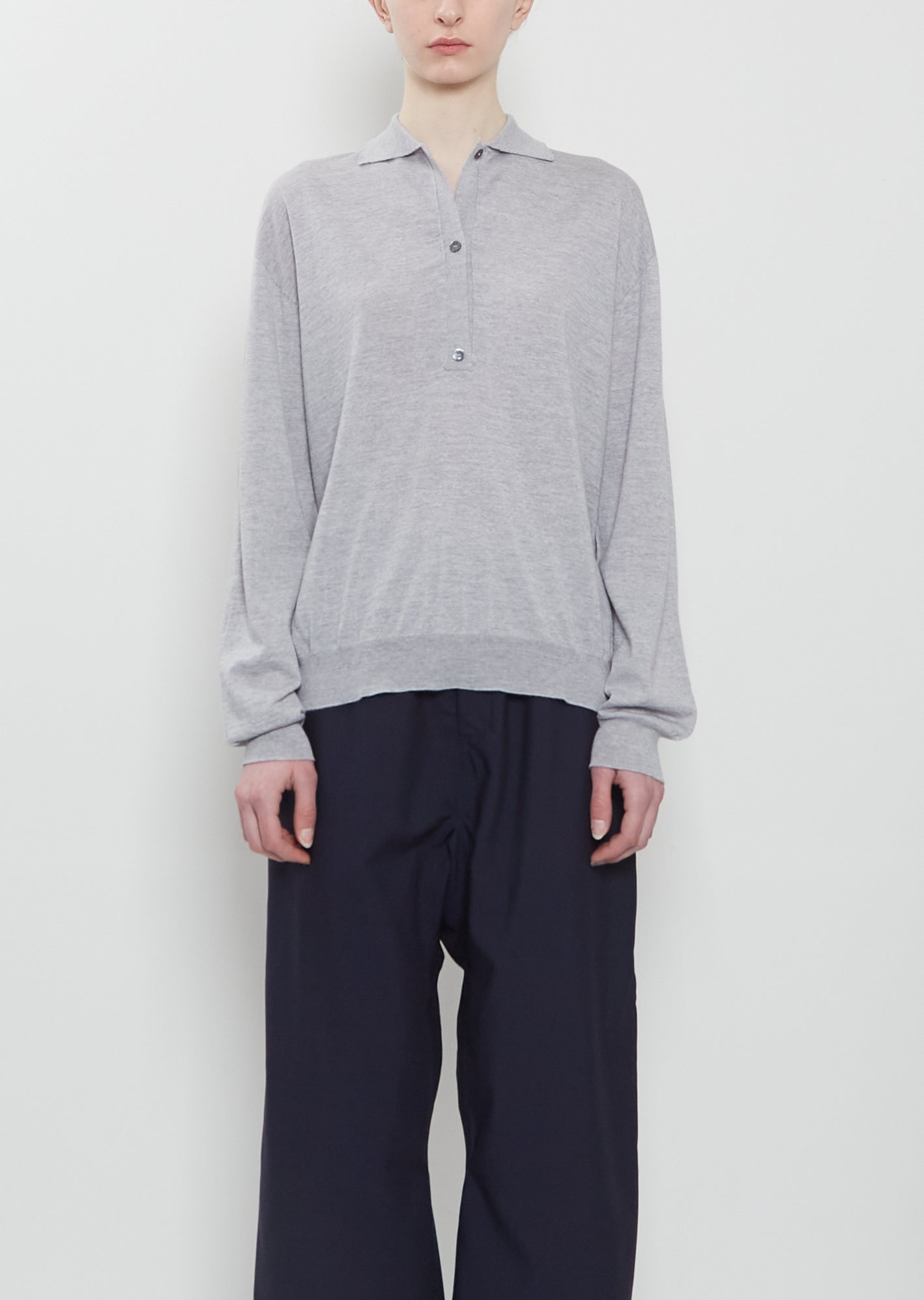 Sofie D'Hoore silver grey polo sweater with a spread collar and shell-hued button half placket in soft and lightweight extra-fine merino wool knit. Features dropped shoulders and elongated sleeves. Finished with ribbed trims at cuffs and hem. Relaxed, easy fit.