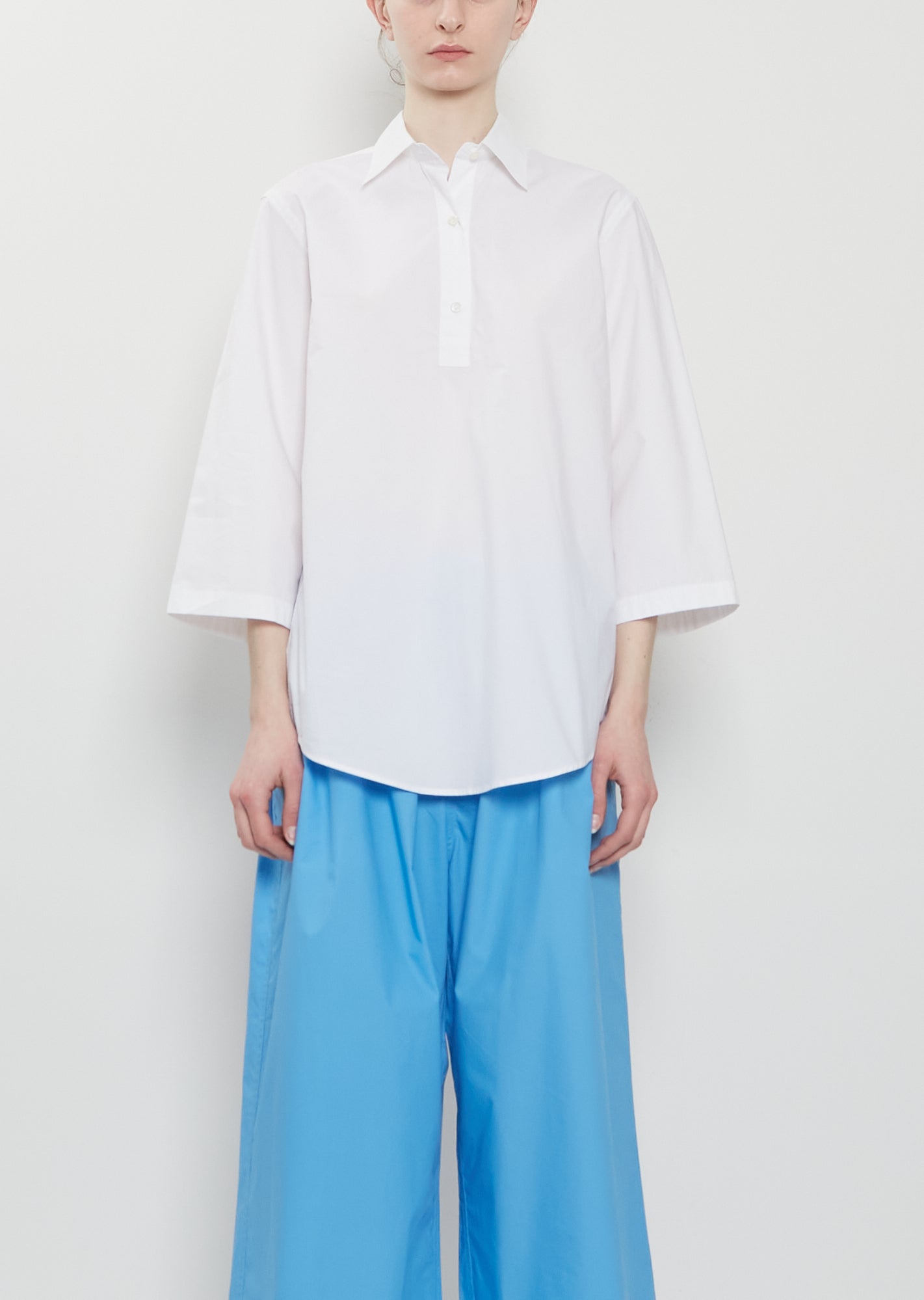 Sofie D'Hoore white shirt with a spread collar and a tonal buttoned half placket in crisp cotton poplin. Features 3/4 length sleeves, box pleat at back yoke and a curved hem at front and back. Relaxed fit.