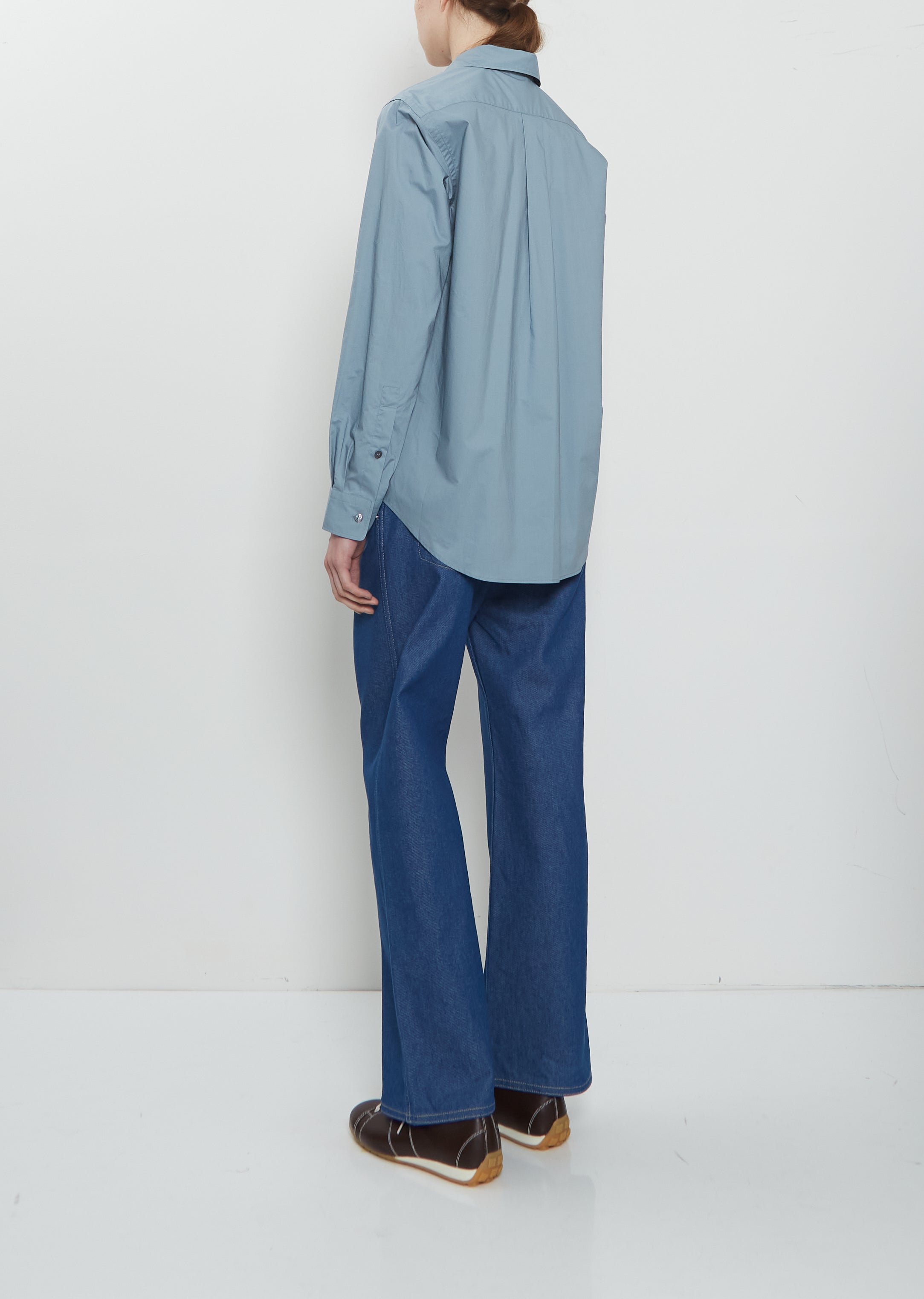 Sofie D'Hoore stone blue shirt with a pointed collar and set-in shoulders in a crisp cotton poplin. Features buttoned cuffs, back yoke with a single box pleat, a curved shirttail and a nacre-hued buttons closure at front.