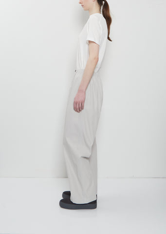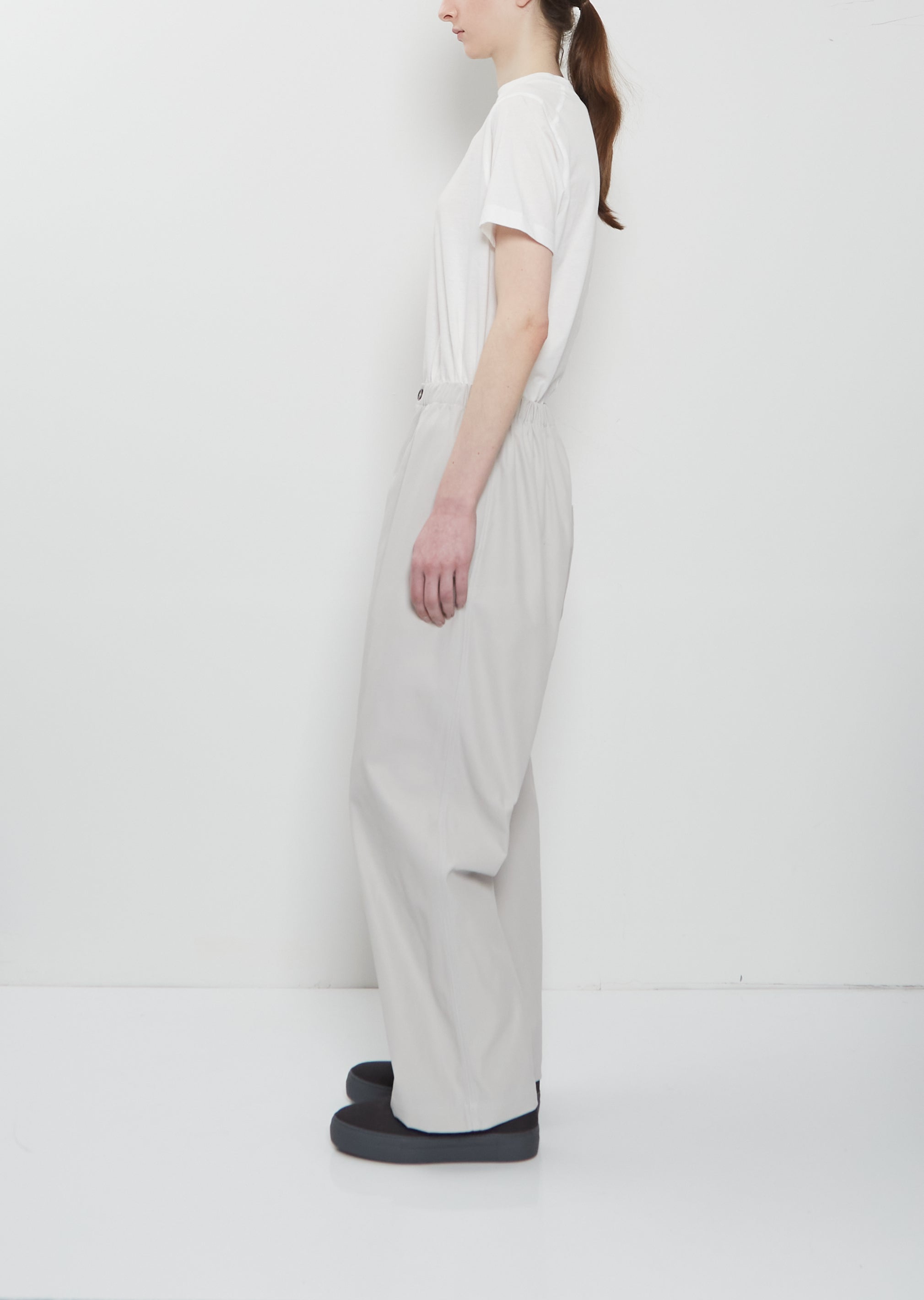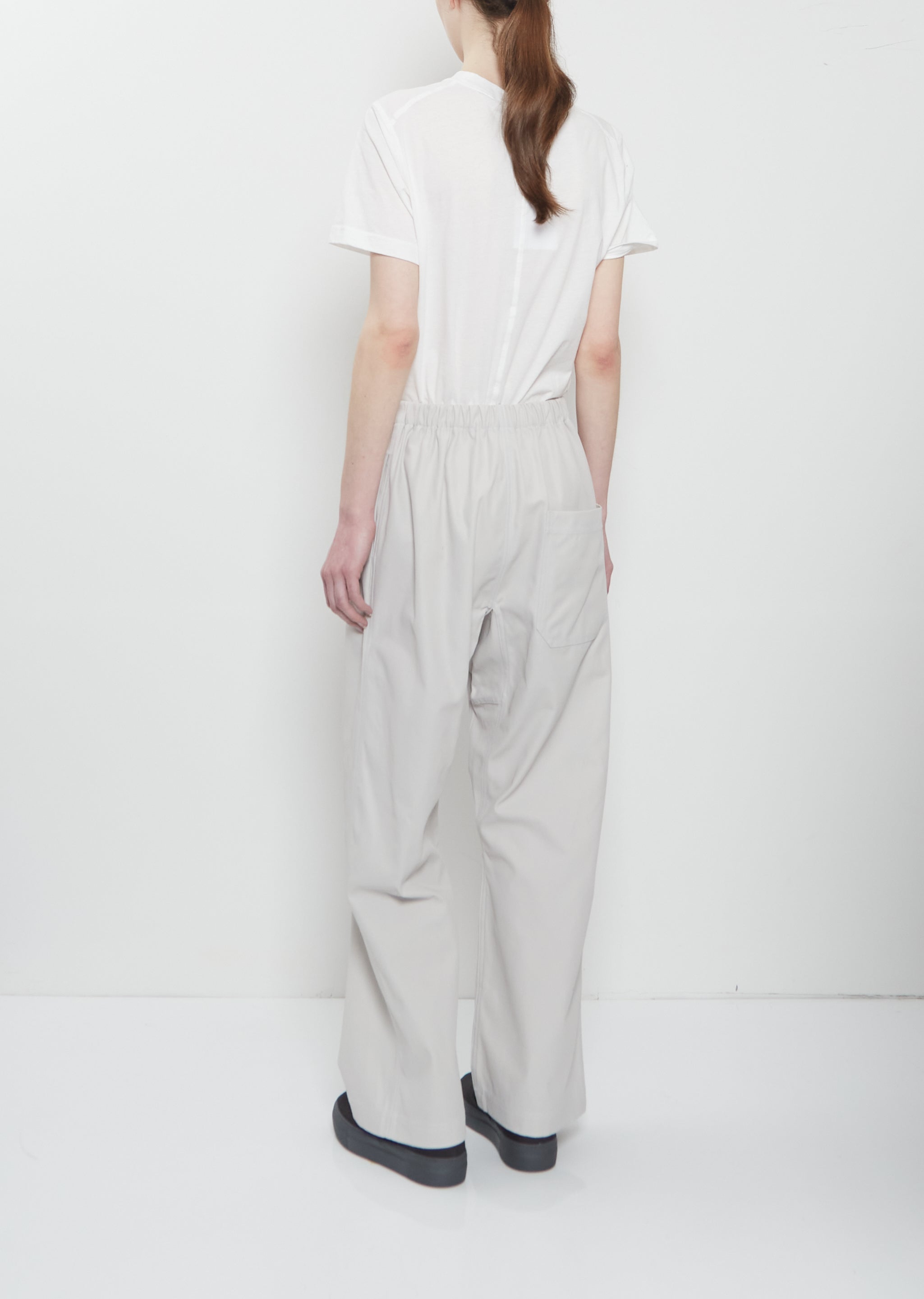 Sofie D'Hoore light grey pants with wide straight legs and an elasticated gathered waist in dense and crisp cotton gabardine. Features side seam pockets, a slight drop crotch, a single patch pocket at back, and a horn-hued button-fly fastening. Relaxed fit.