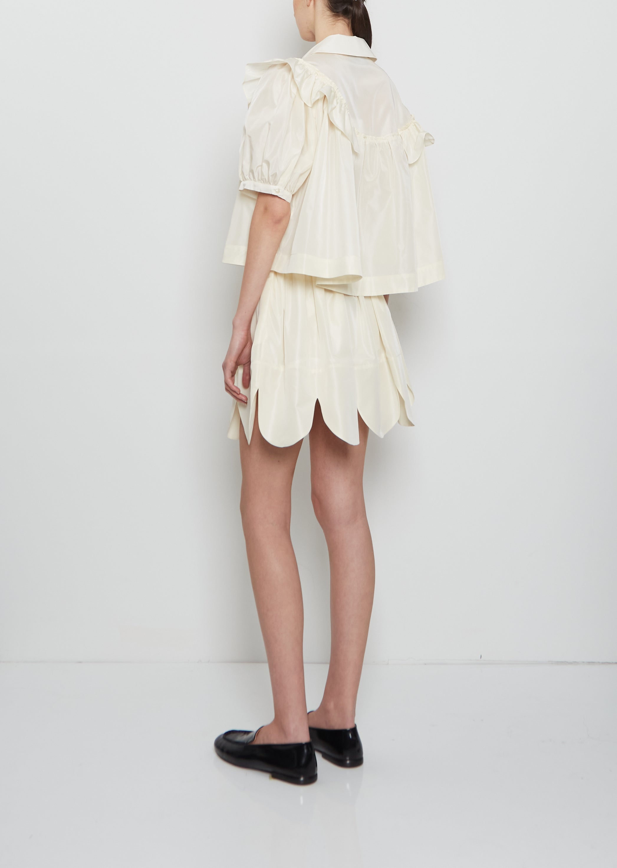 Simone Rocha cream pull-on mini skirt with a scalloped hem detail in a smooth and lightweight taffeta. Features an elasticated waistband and side seam pockets. Comes lined in tonal cupro blend fabric. Regular fit.