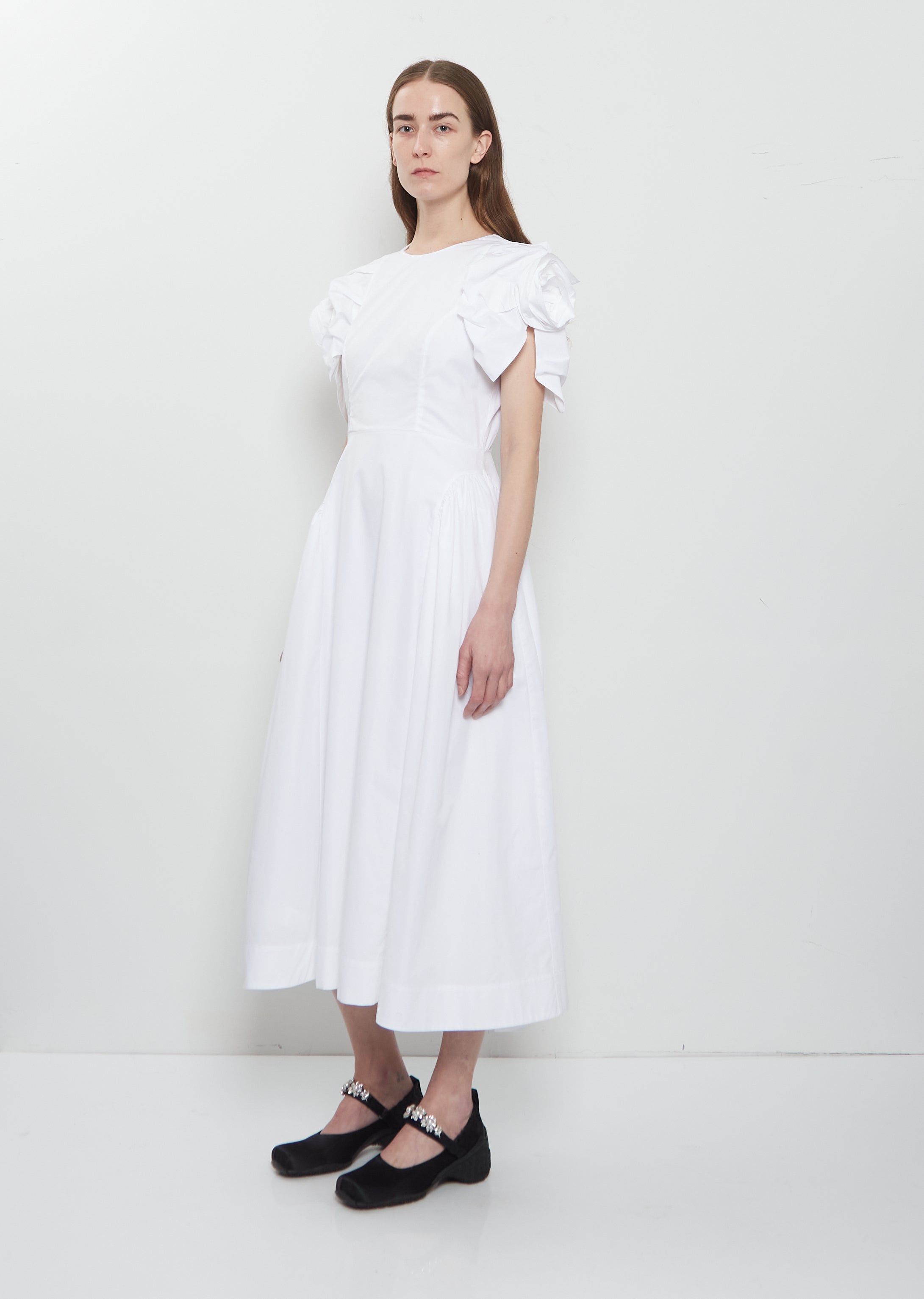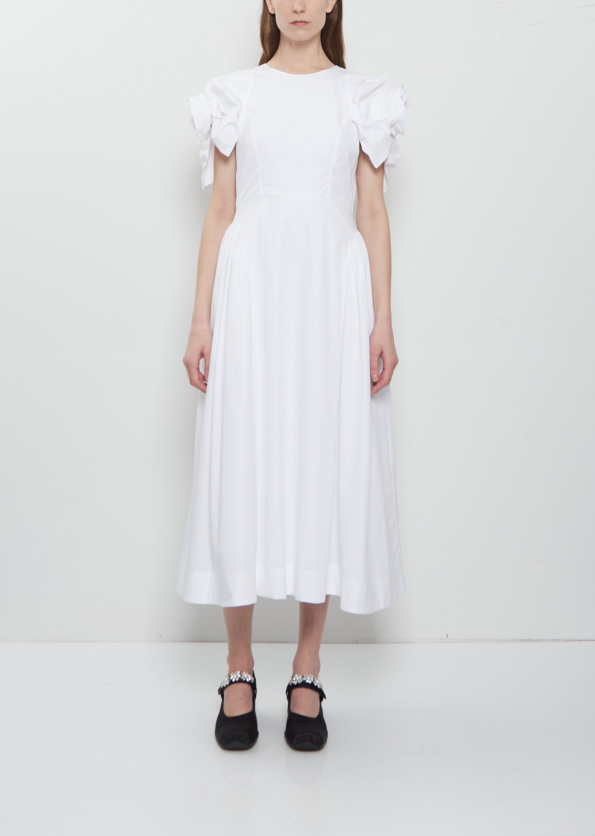 Simone Rocha white A-line dress with signature short puffed sleeves with rose detail in crisp and soft cotton poplin. Features a round neckline, a fitted bodice, gathered hip details, concealed side seam pockets and a concealed zipper closure at back. Regular fit.