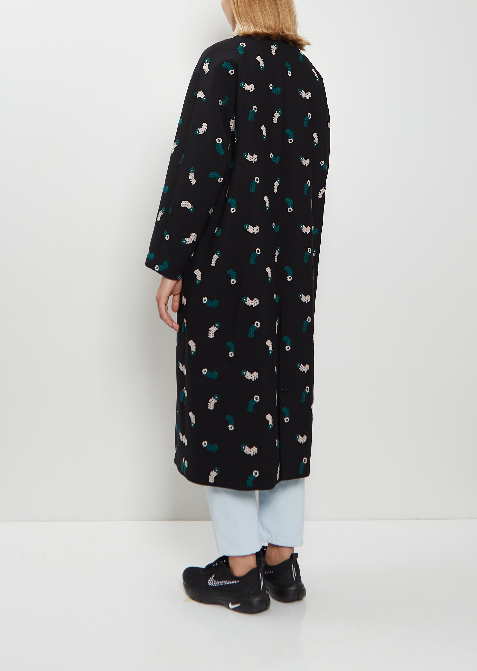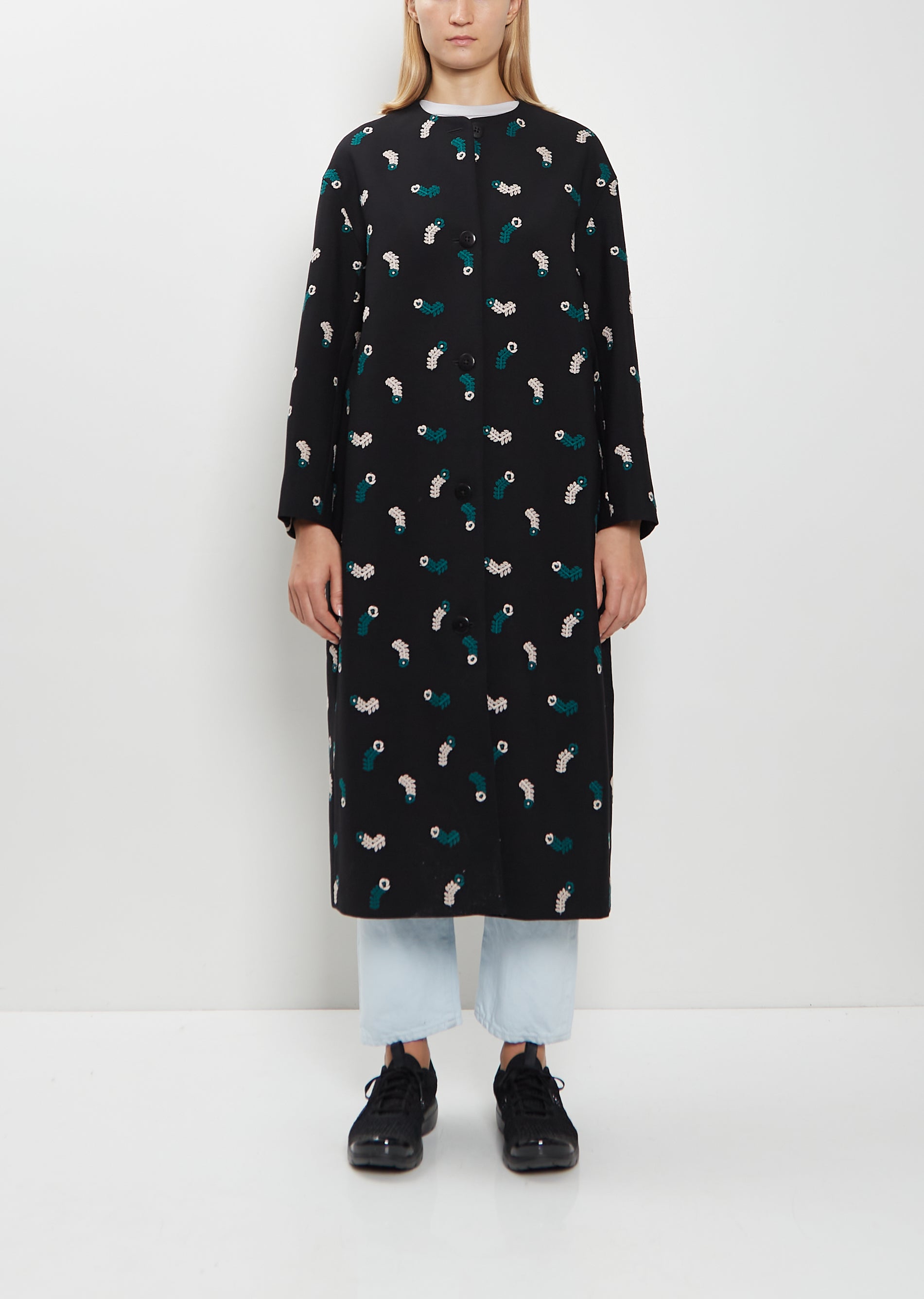Minä Perhonen black collarless coat with floral embroidery throughout in wool. Features a round neckline, slightly dropped shoulders, side seam pockets, vent at back, an interior buttoned slip pocket, and a tonal button front closure. Lined in grey polyester twill.
