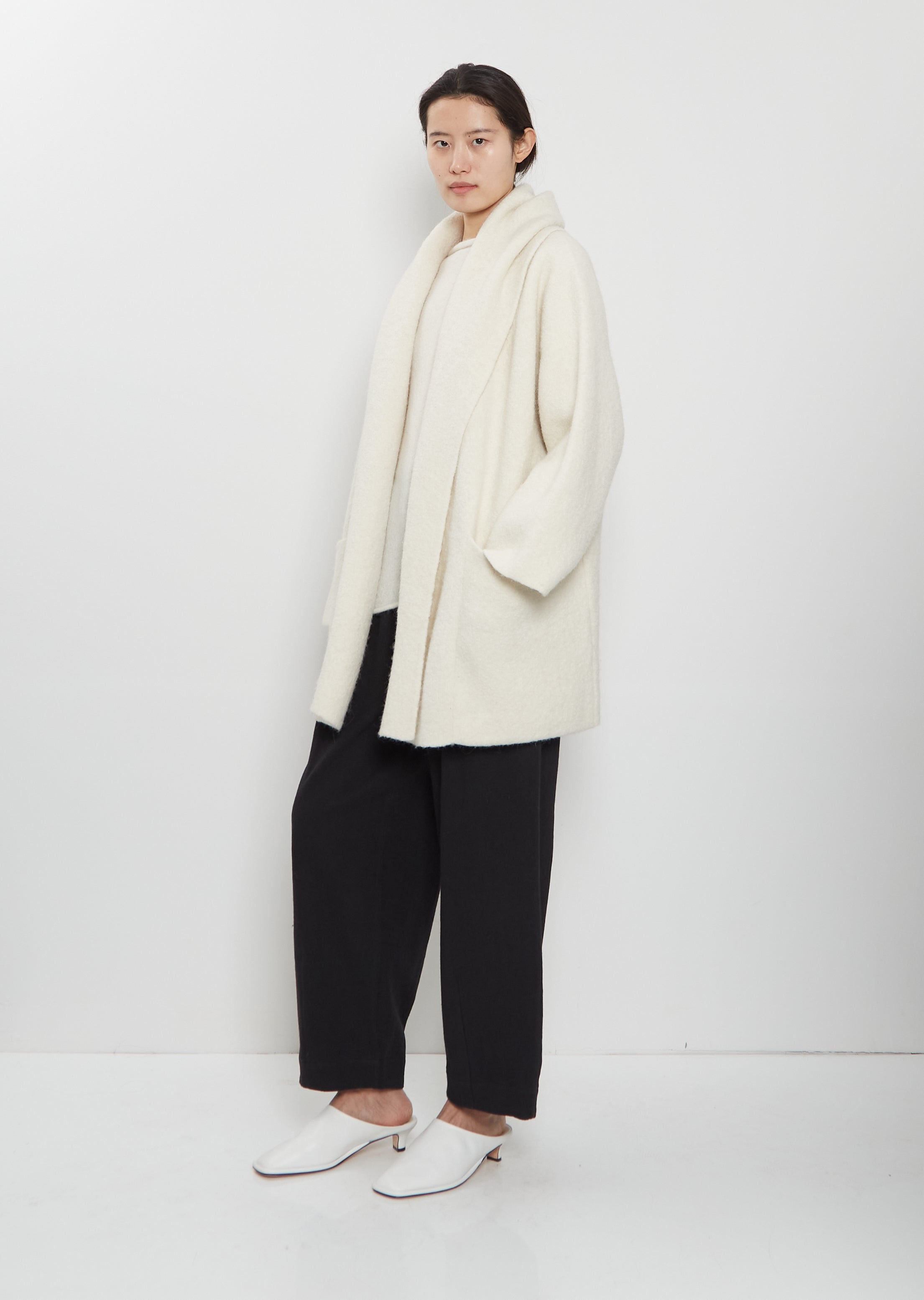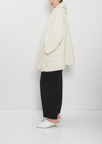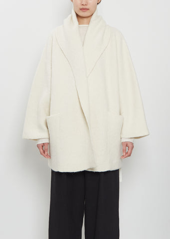 Lauren Manoogian raw white signature short coat with a wrap open front and wide draped collar in double faced alpaca and extra fine merino wool blend knit. Features deep patch pockets, straight hem and clean finished edges. This coat is unlined.