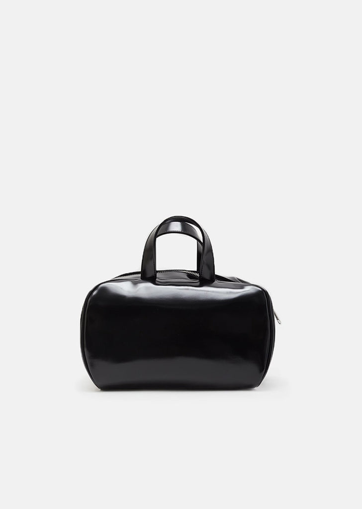 Black PVC bowling bag with short twin handles and silver-toned zip top. Fully lined in a tonal, tightly knit nylon mesh. Single interior patch pocket. Silver-toned feet at the bottom to protect base. Color: Black. 100% PVC. Made in Japan.