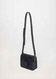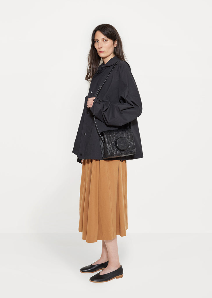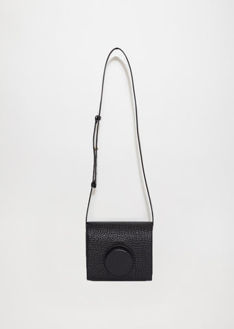 A vintage-inspired camera bag in boldly pebbled, vegetable-tanned leather, styled after an analog camera with a sculptural lens-shaped projection at the front.