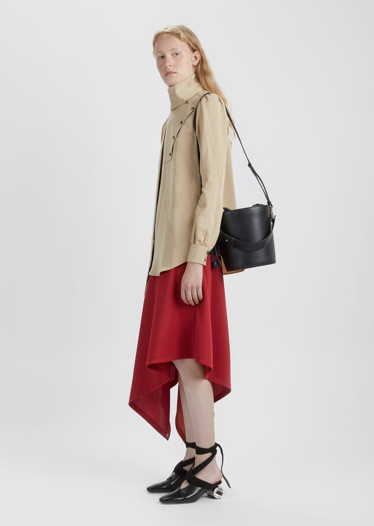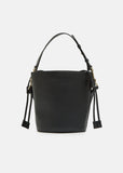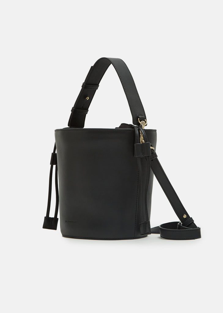 Black structured leather bucket bag with black drawstring canvas pouch. Adjustable long strap and removable handle for multiple carrying options. Gold hardware. Stamped logo on exterior. Color: Black. 100% Calf Leather. Interior Pouch: 100% Canvas. Made in Spain.