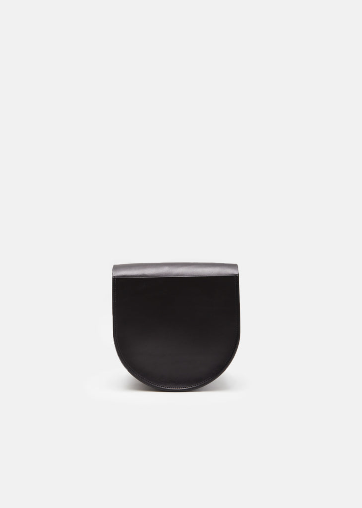 Black leather minimal saddle bag with long adjustable strap. Flap with slide-in closure. Slip pocket on back. Raw leather interior. Logo stamp on strap. Color: Black. 100% Leather. Made in the USA.