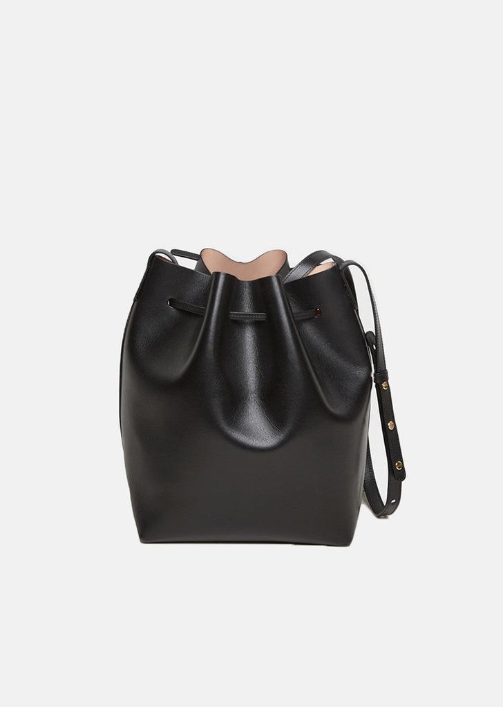 Black signature vegetable-tanned leather bucket bag with a smooth exterior and subtly contrasting interior finish in pink. Drawstring top closure with leather tie. Single interior compartment. Removable leather zip pouch included. Gold embossed logo at front. Color: Black/Ballerina. 100% Vegetable-tanned leather. Made in Italy.