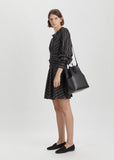 Black signature vegetable-tanned leather bucket bag with a smooth exterior and subtly contrasting interior finish in navy. Drawstring top closure with leather tie. Single interior compartment. Removable leather zip pouch included. Gold embossed logo at front. Color: Black/Blu. 100% Vegetable-tanned leather. Made in Italy.