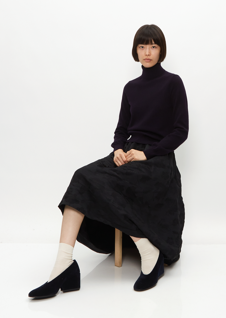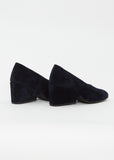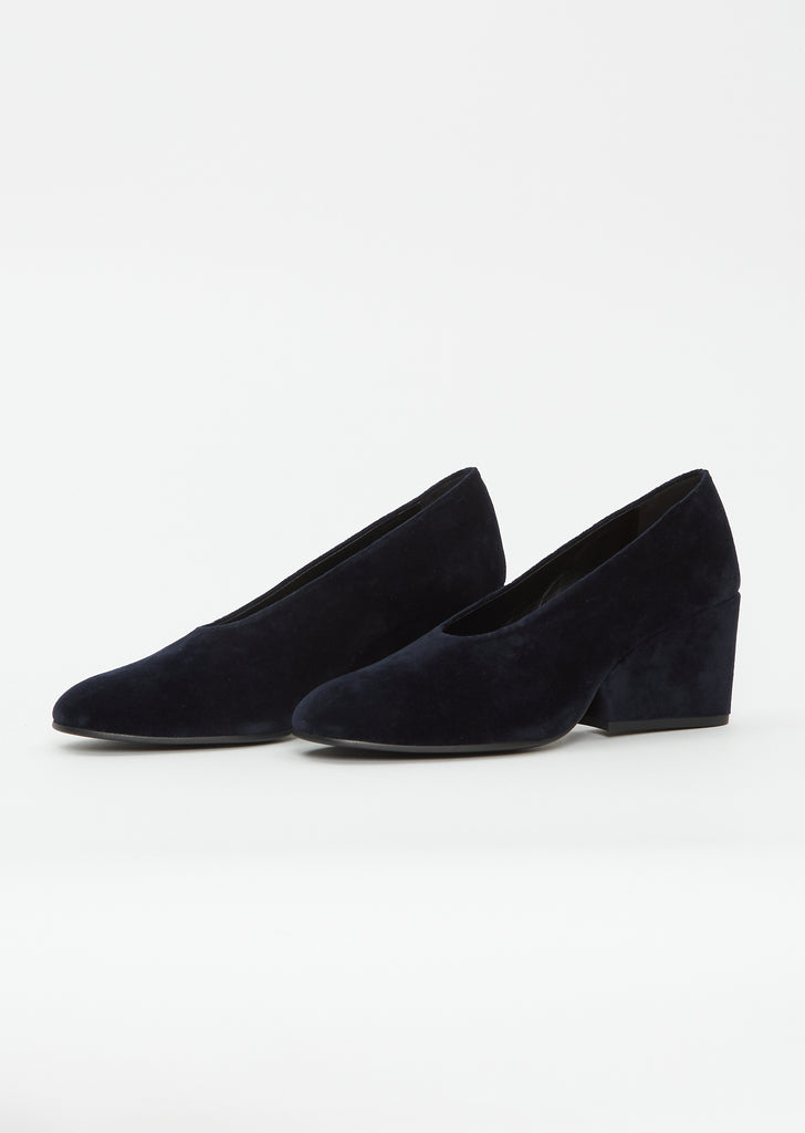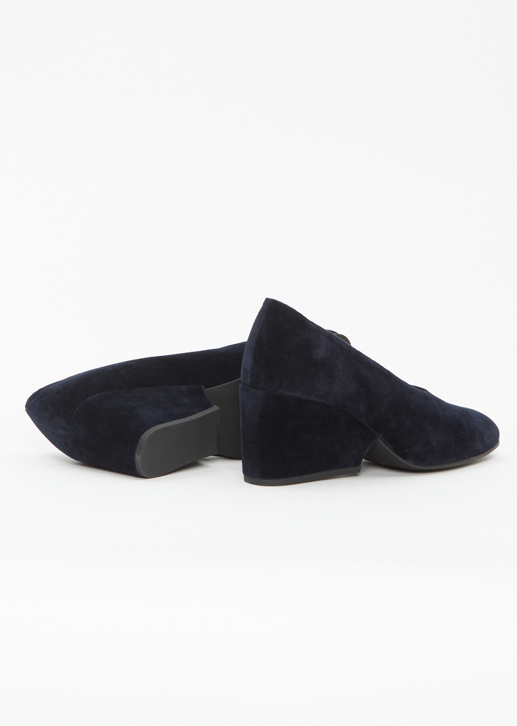 Comme des Garçons navy court shoe with an oblique toe in cotton velvet. Lined in black leather and grounded by a wide sculptural heel with an anti slip sole.