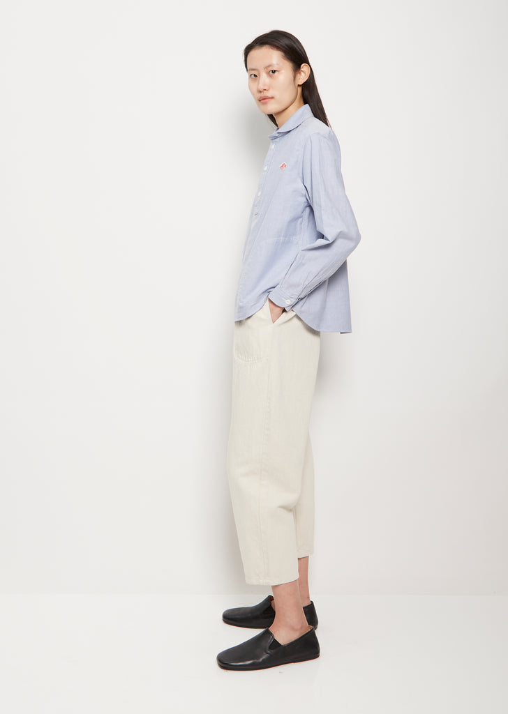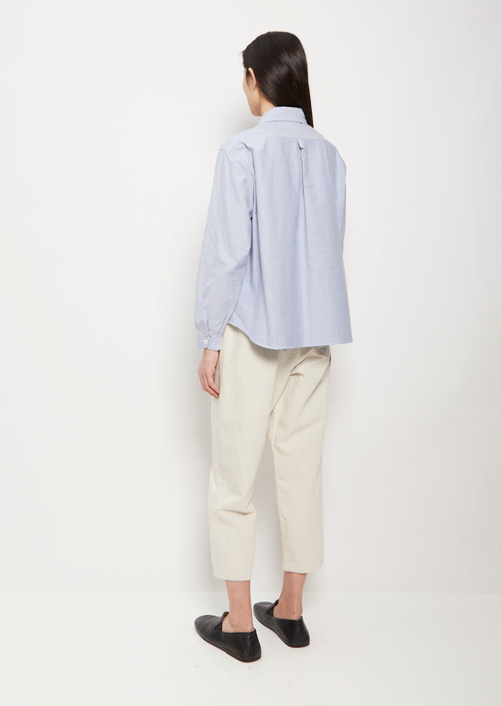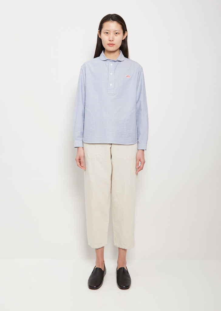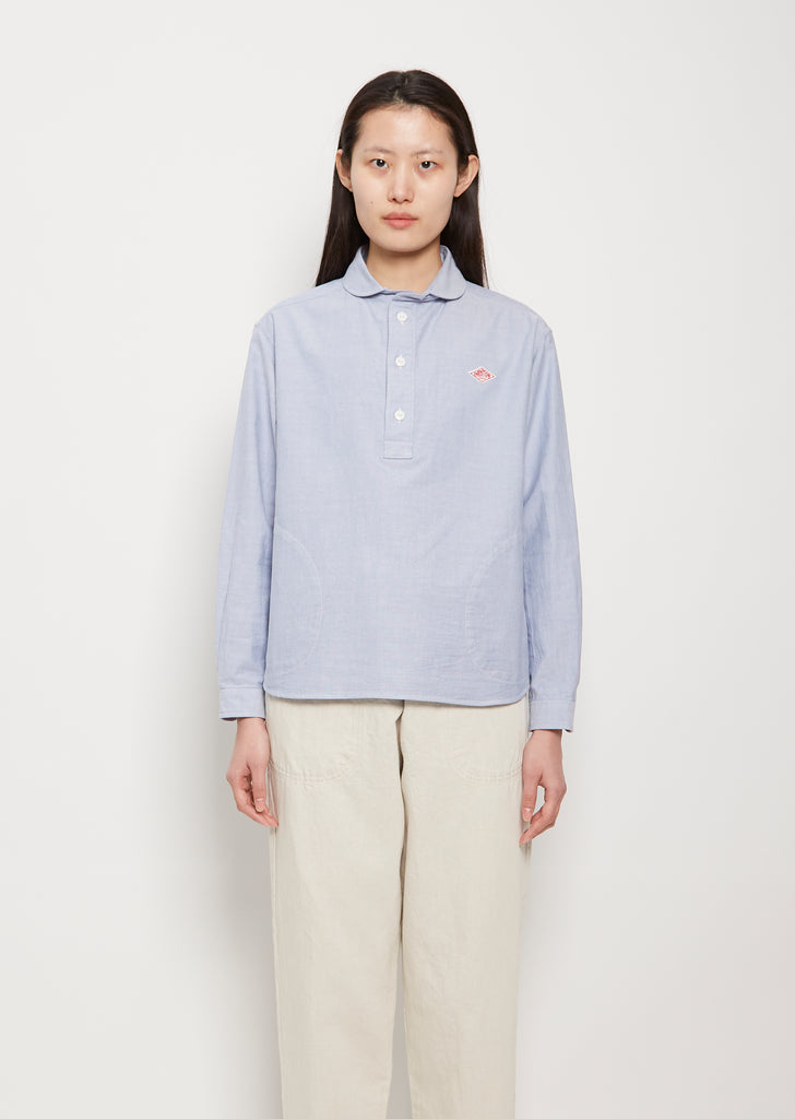 Danton blue shirt with round collar in cotton poplin. Features a three quarter button front, logo on chest, curved hem, and button sleeve cuffs. Relaxed, boxy fit.