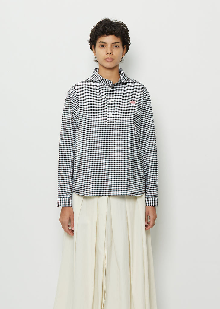 Danton black gingham shirt with round collar in cotton poplin. Features a three quarter button front, logo on chest, curved hem, and button sleeve cuffs. Relaxed, boxy fit.
