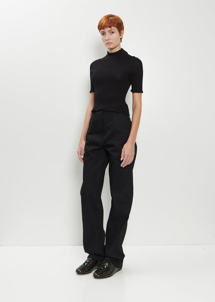 Cecilie Bahnsen black high-waisted trousers with wide, straight legs in dense floral embroidered cotton denim. Features belt loops, 5-pocket construction, signature embroidered floral motifs at back pockets, and a button and zip-fly fastening. Regular fit.