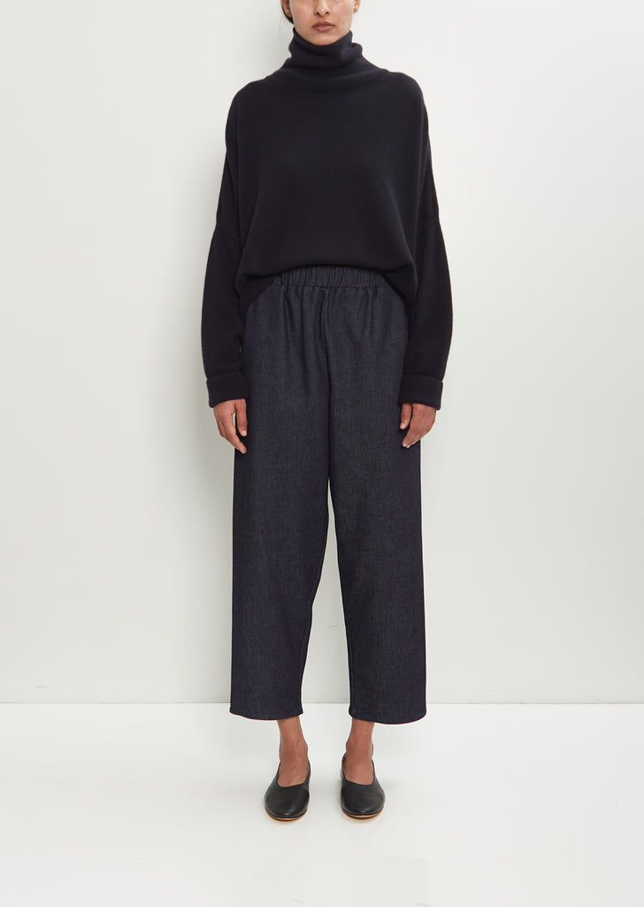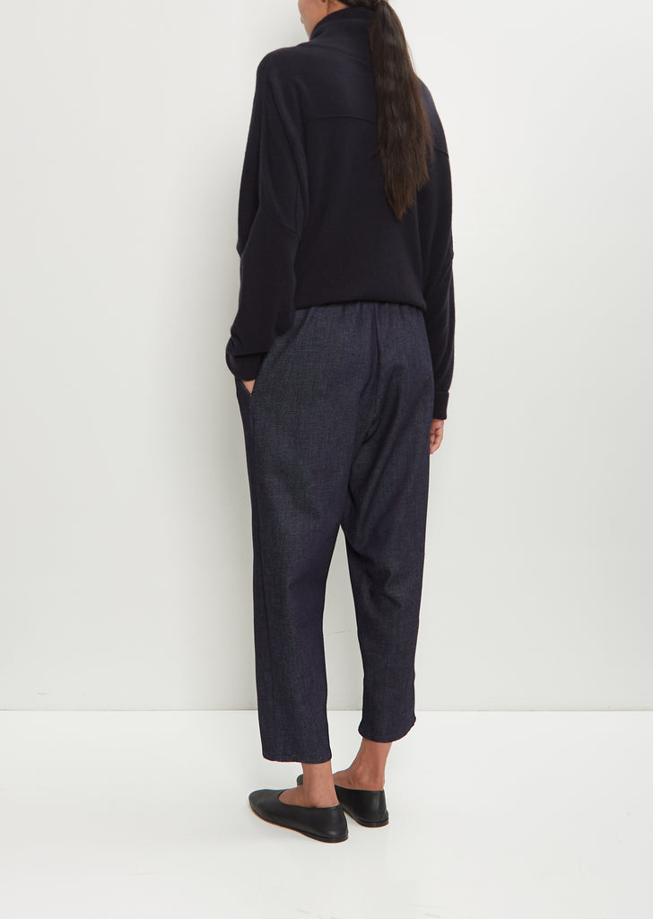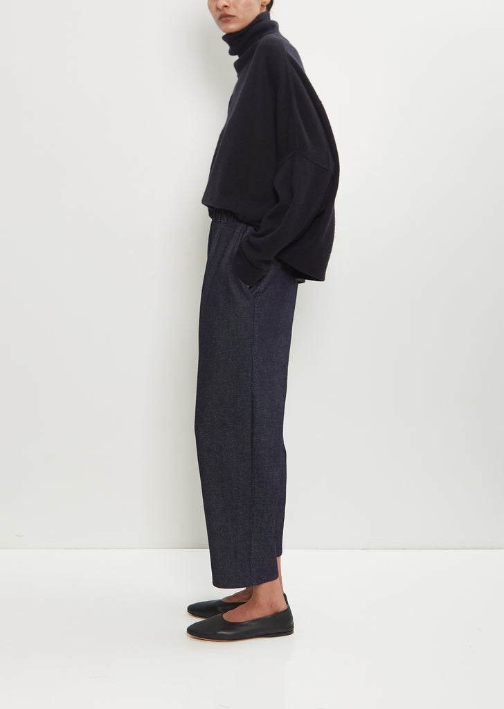 Dušan signature pull-on trouser with tapered, cropped legs crafted in ink blue cotton denim. Features an elasticated waist and angled side pockets. Relaxed fit.