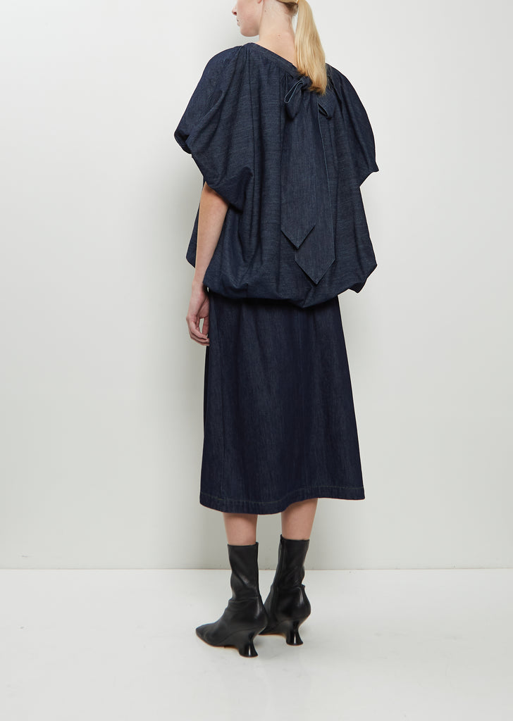 Dries Van Noten indigo blue top with a boat neckline and a voluminous, gathered silhouette in soft cotton denim twill. Features pleating along neckline, gathering at cuffs and hem, and a tie detail at back neck. Fully lined in a smooth black viscose cupro blend twill.
