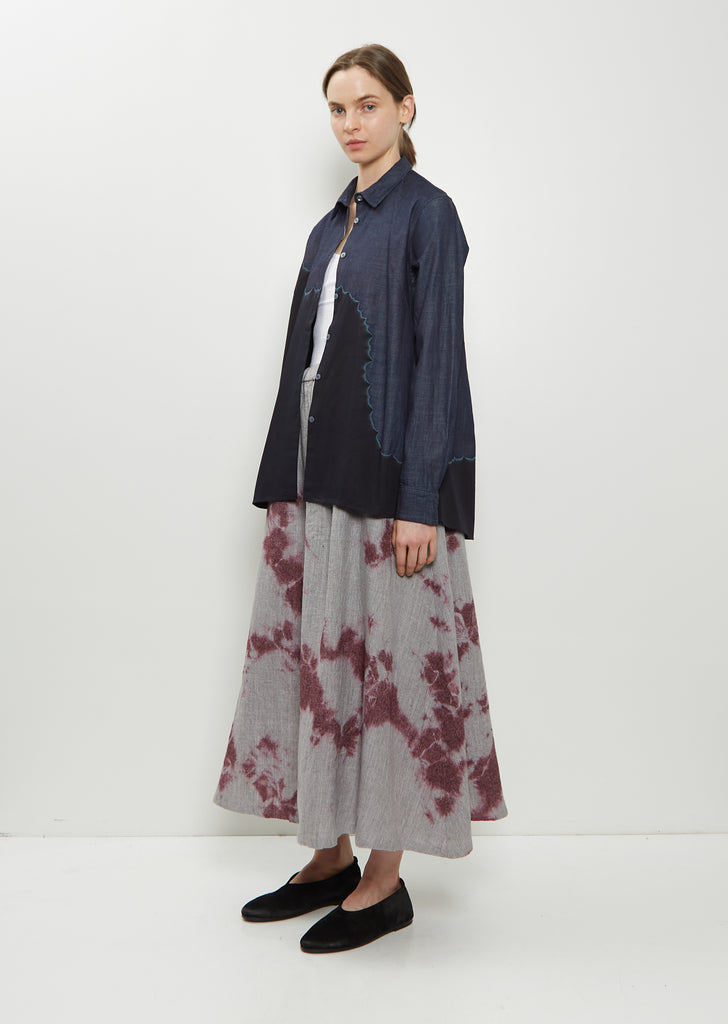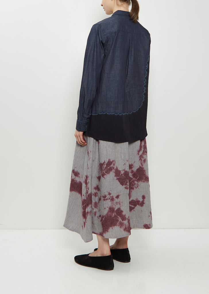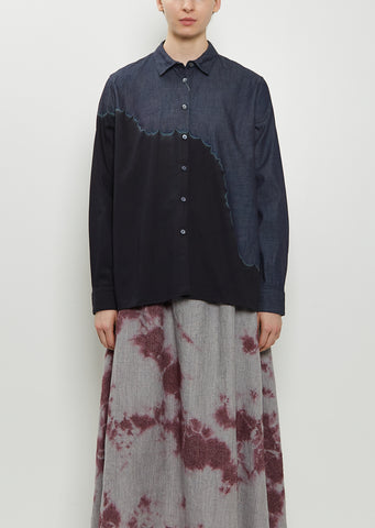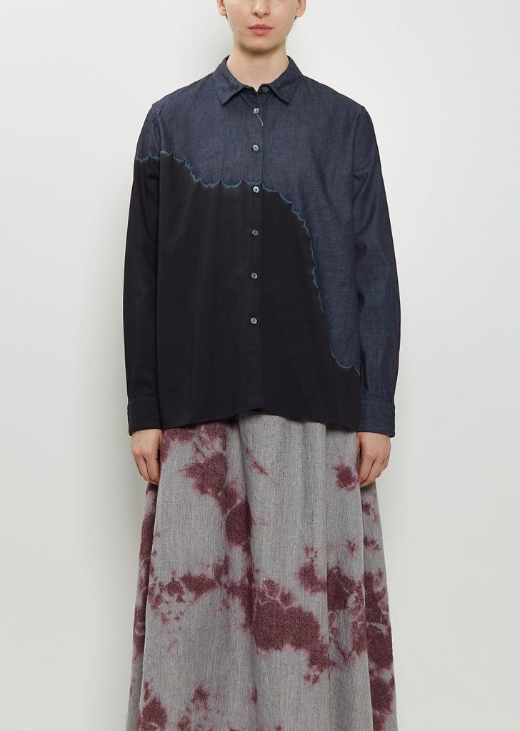 Suzusan black and indigo blouse with a classic collar and tonal button front in lightweight cotton denim with a traditional Shibori pattern. Features buttoned cuffs and a box pleat at back yoke.