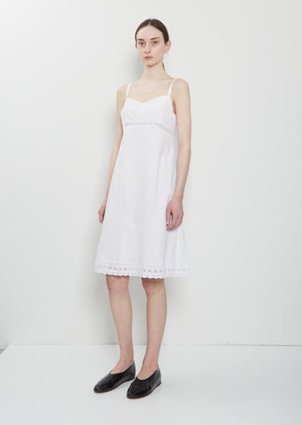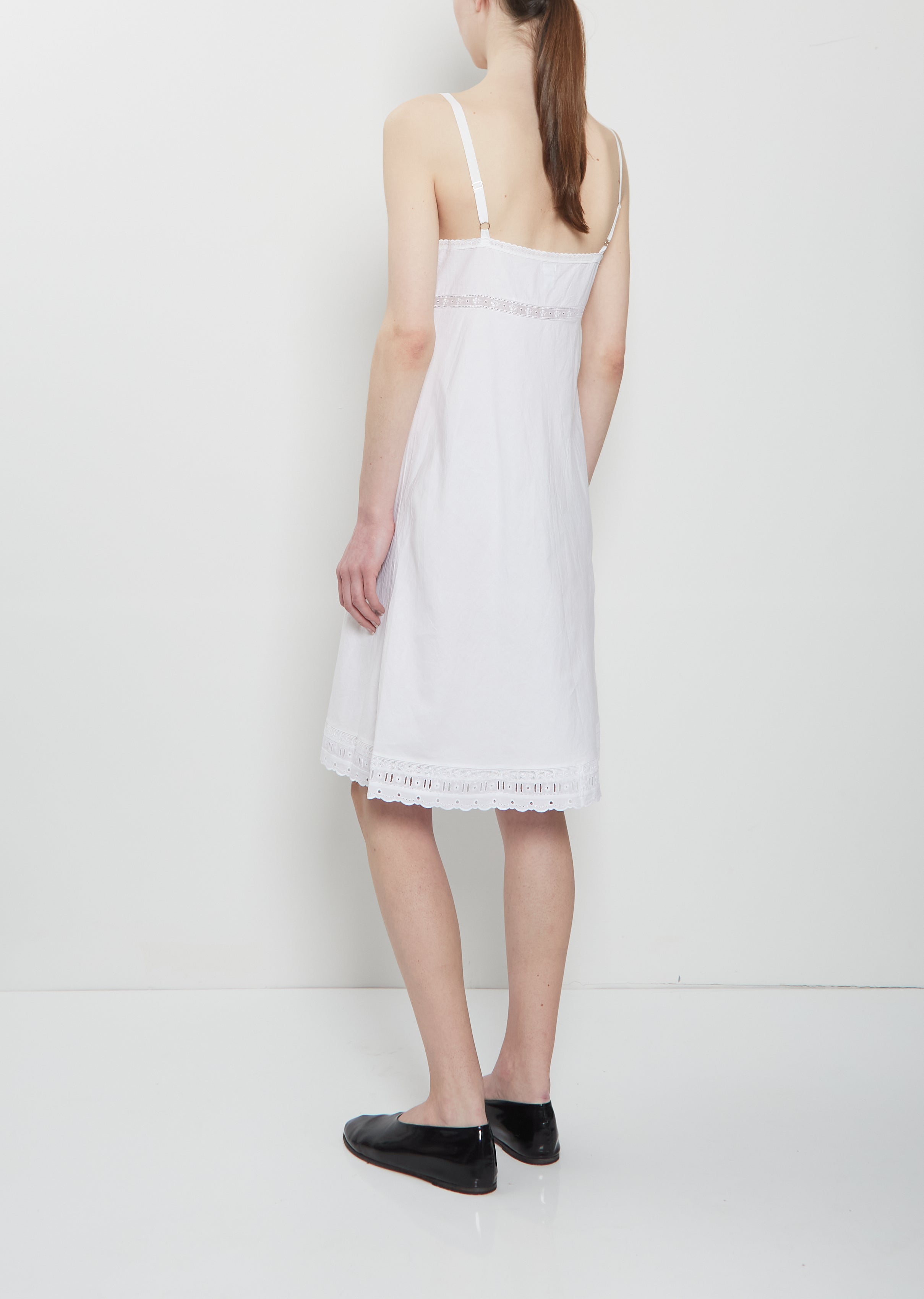 dosa rice white pullover dress with embroidered eyelet details at neckline, chest and hem in a dense khadi cotton. Features adjustable shoulder straps and scalloped detailing at slight V-neckline.