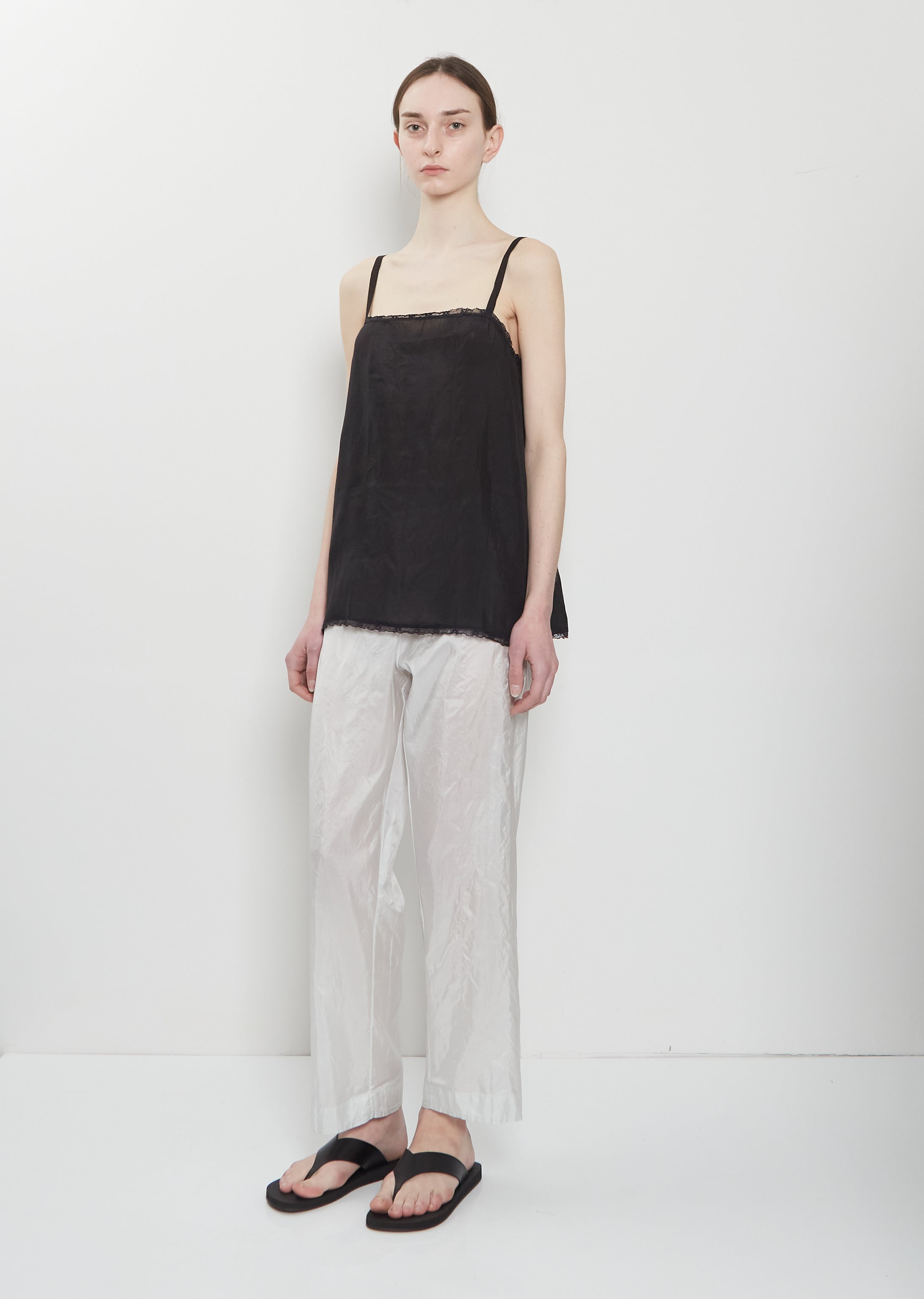 dosa midnight camisole top with embroidered trim at straight neckline and hem in a lightweight and luxurious khadi silk. Features adjustable shoulder straps and a frayed edges finish. Relaxed fit.