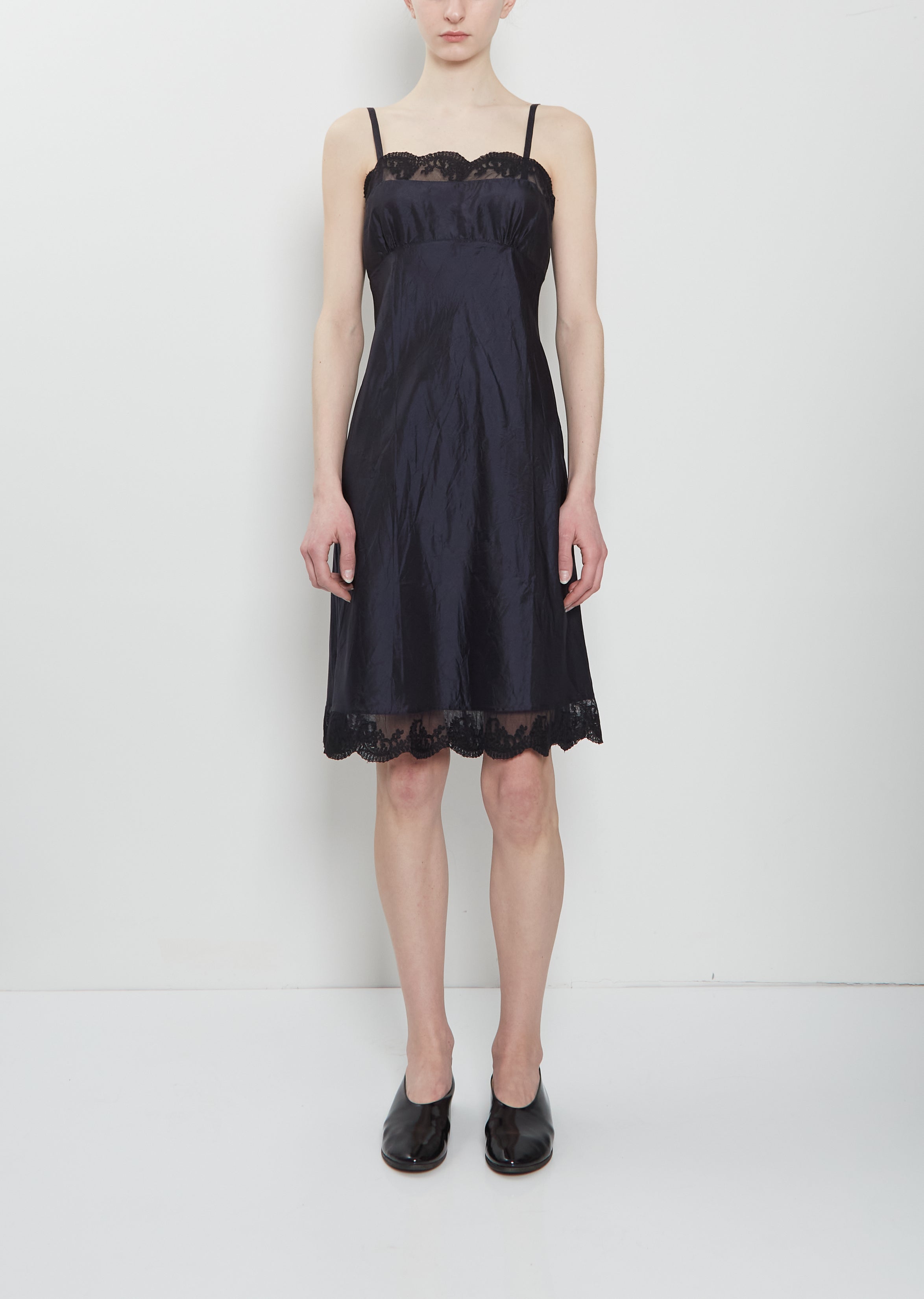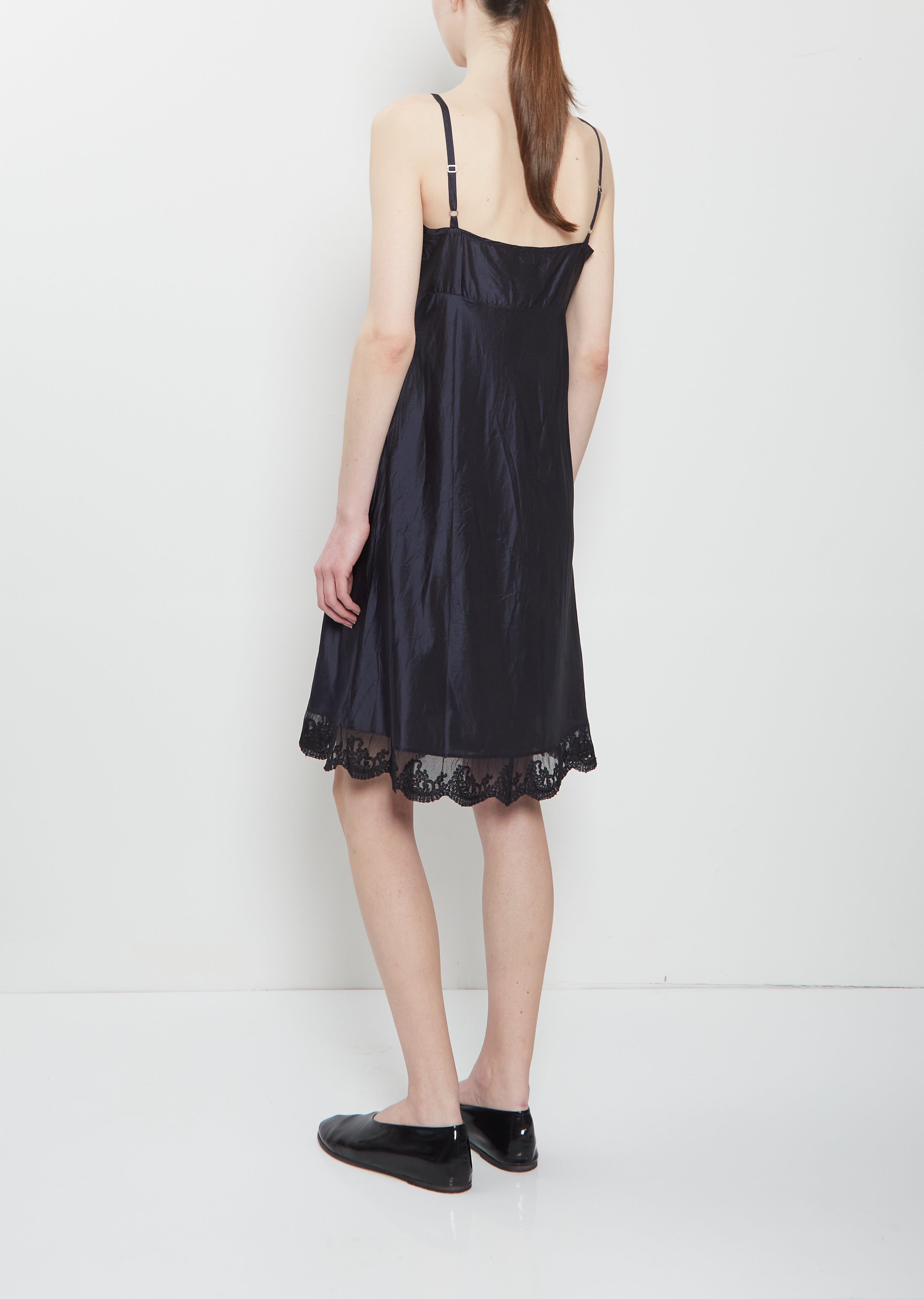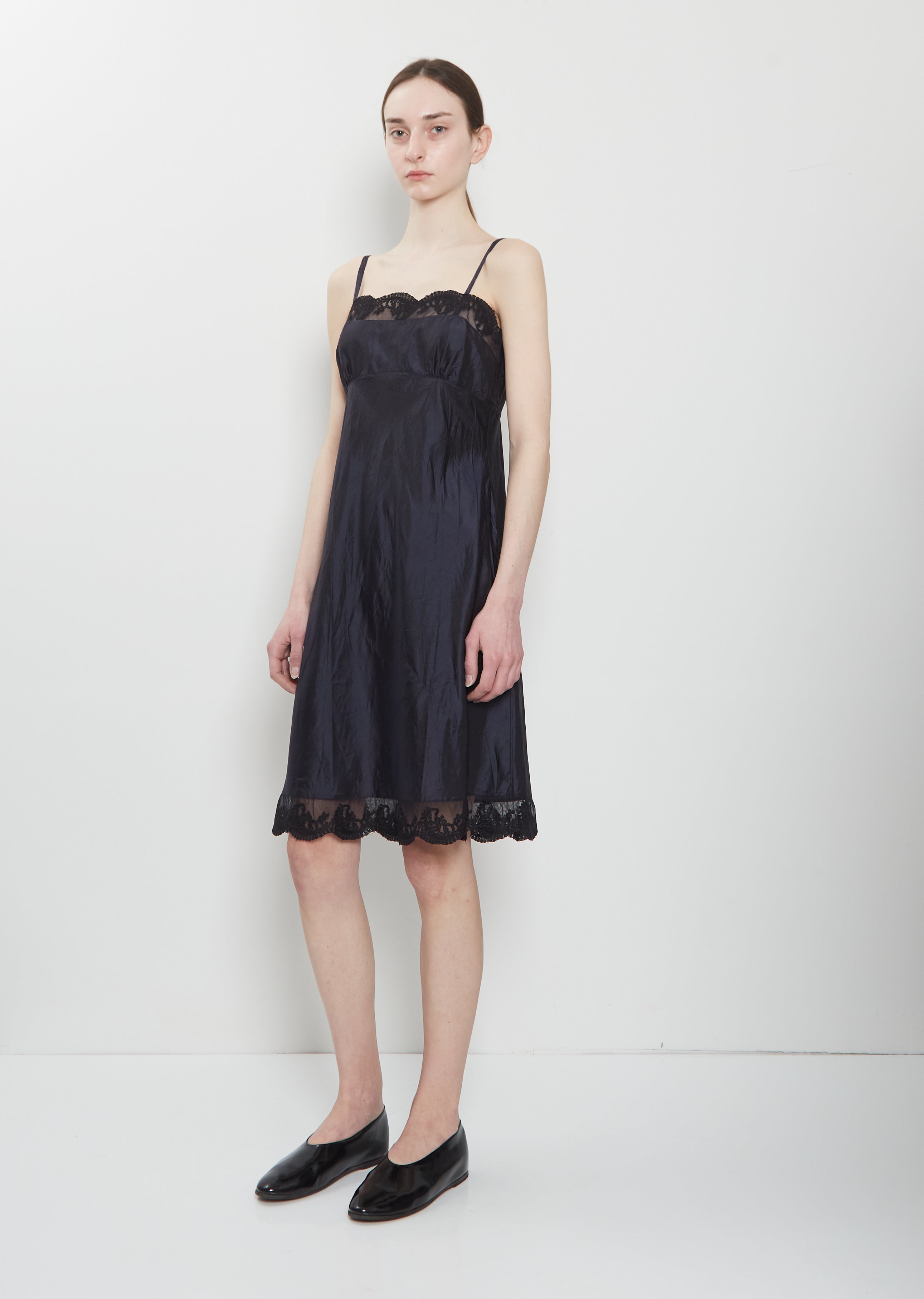 dosa navy and black short slip dress with lace detailing at neckline and hem in smooth and luxurious silk habutai. Features adjustable shoulder straps.