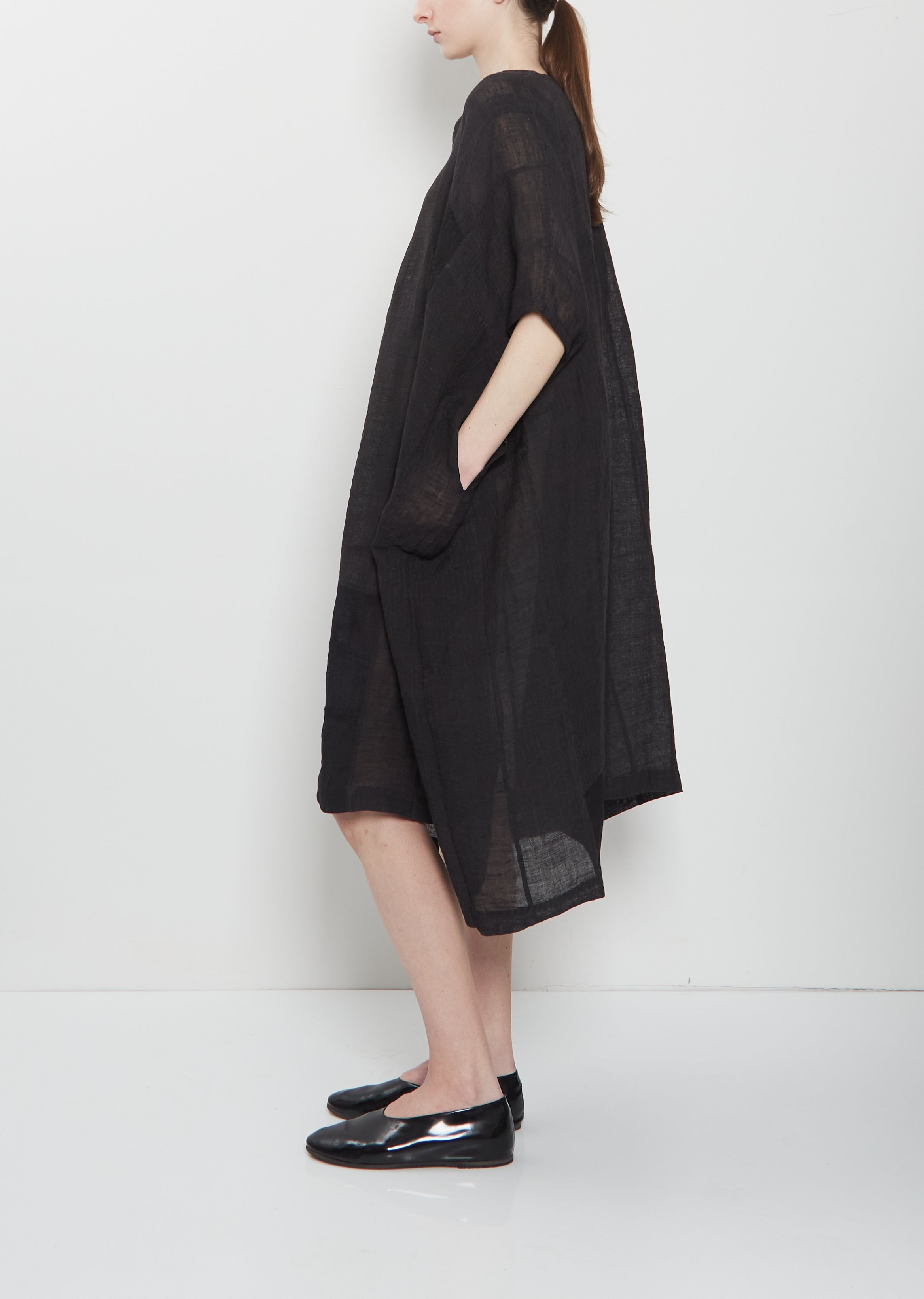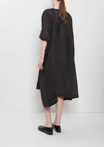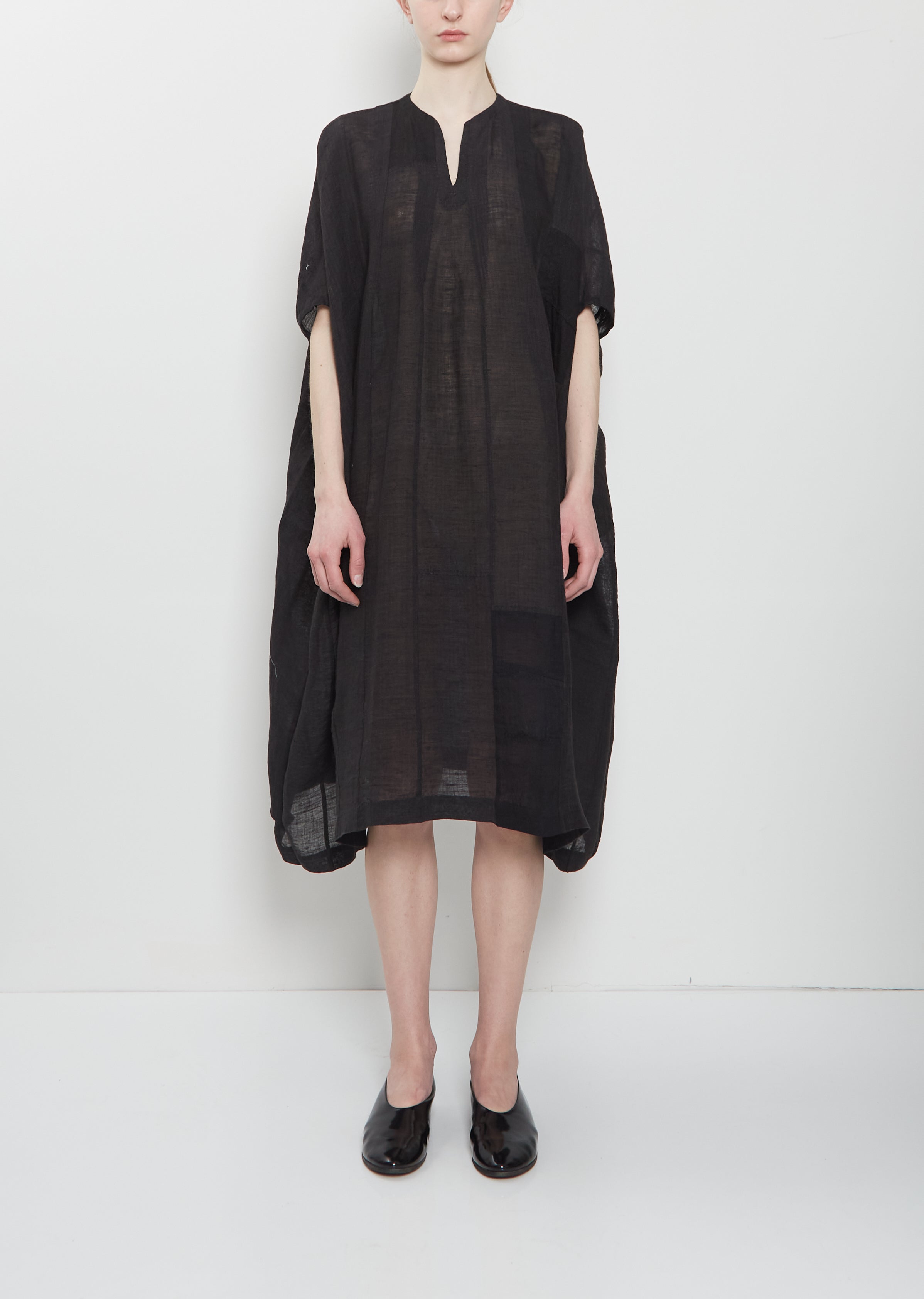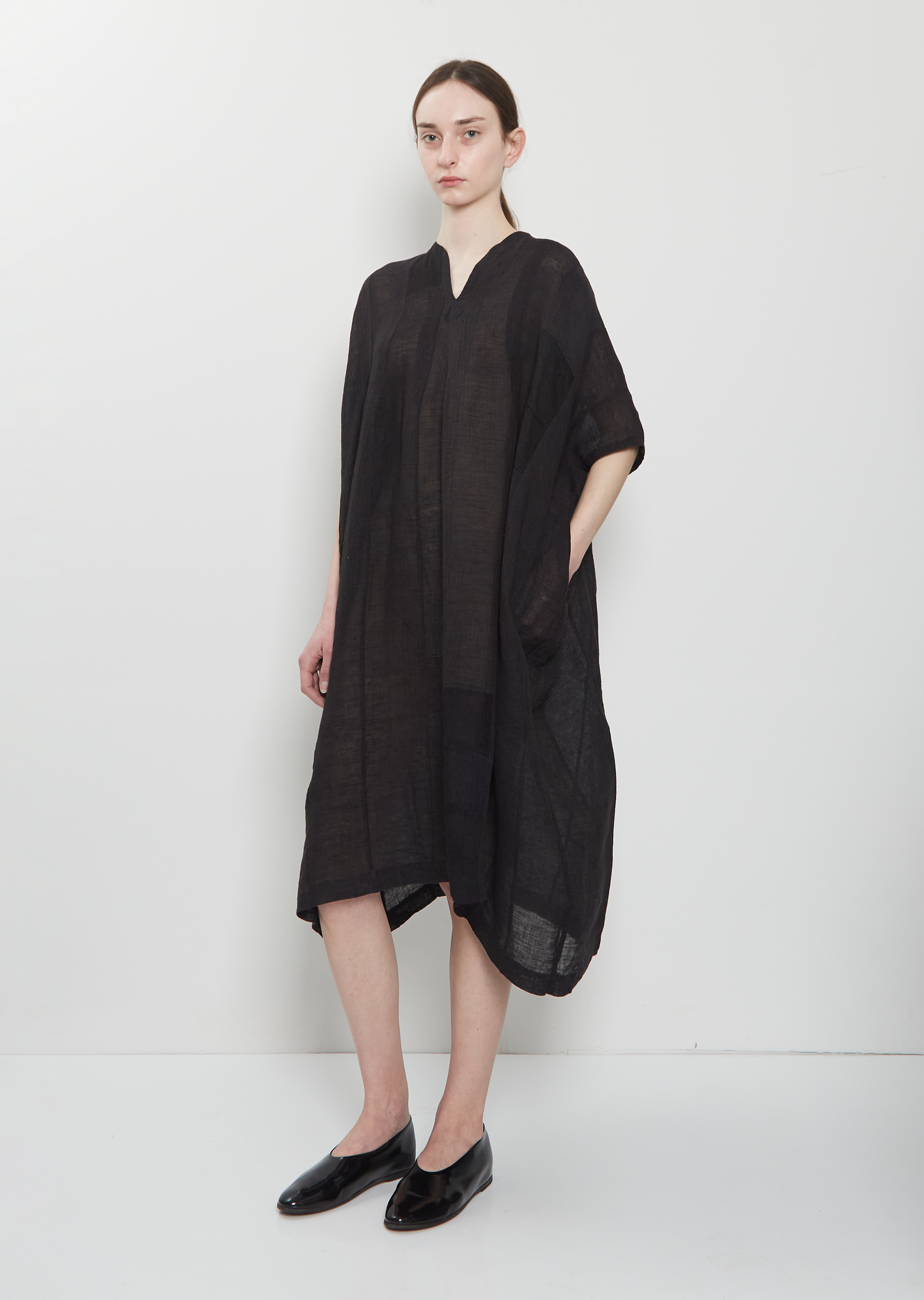 dosa midnight relaxed tunic dress with short dolman sleeves in handwoven linen with a patchwork design. Features a notched V-neckline and side seam pockets. Relaxed fit.