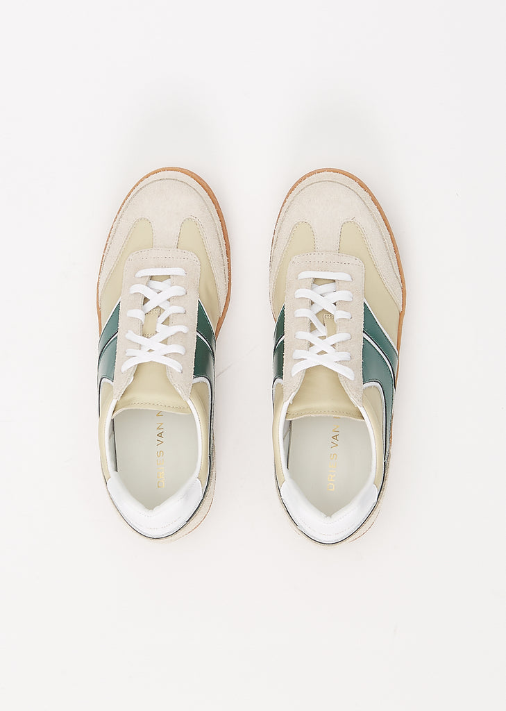 Brand Signature Piece — Dries Van Noten grey low top lace up retro inspired sneaker crafted in leather with suede detailing. Fully lined in ivory leather and grounded with a tan treaded rubber sole. Finished with white laces and a white leather logo embossed heel cap.