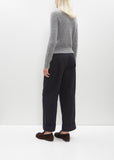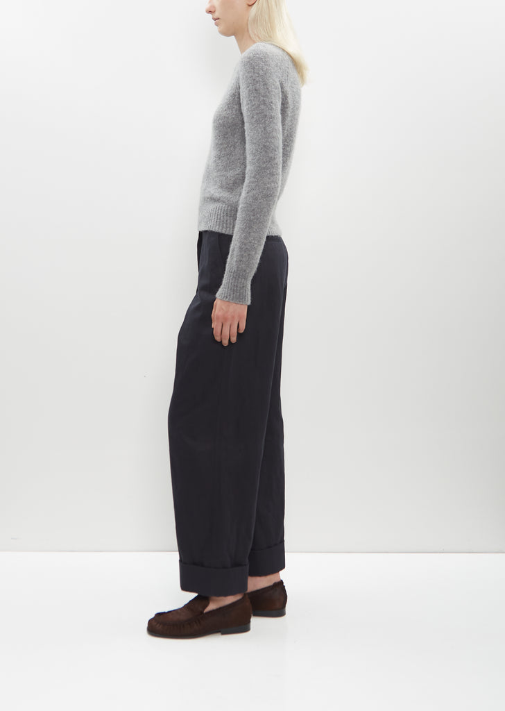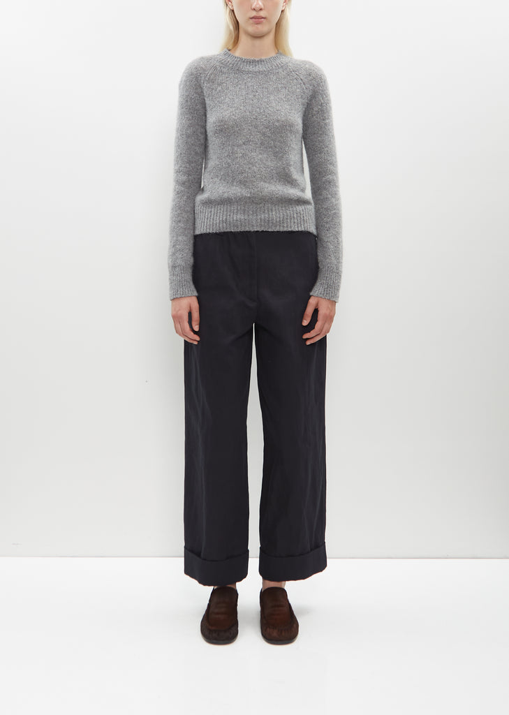 Dries Van Noten mid-grey crewneck sweater in alpaca and merino wool blend knit. Features elongated raglan sleeves, and a rib trim finish at neckline, sleeve cuffs and hem. Closer fit.