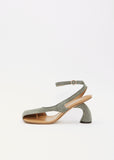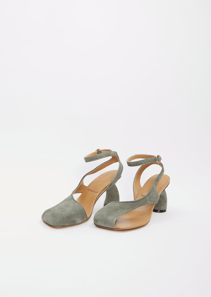 Dries Van Noten light grey cutout heel with a half open toe and toe thong in suede. Features a wrap around ankle strap with a gold-tone buckle and set on a covered sculptural angled heel with a rounded shape. Fully lined in soft tan leather.