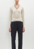 Dries Van Noten ecru V-neck sweater with pale lavender and ochre stripe ribbed neckline in merino wool. Features a wide rib trim sleeve cuffs and hem. Slim fit.