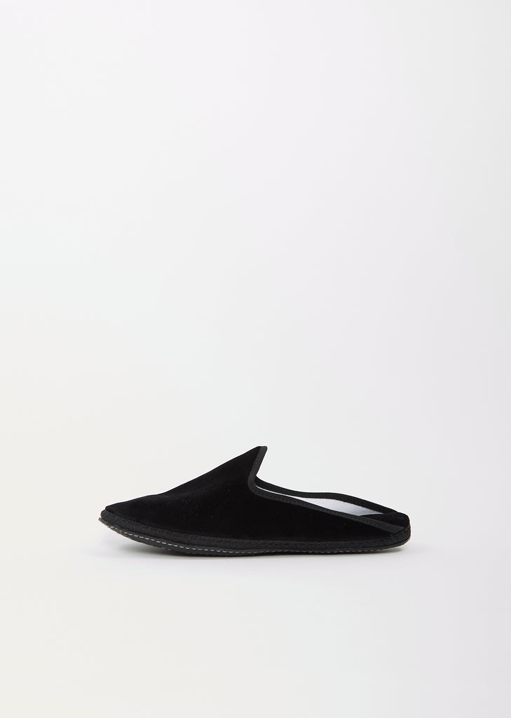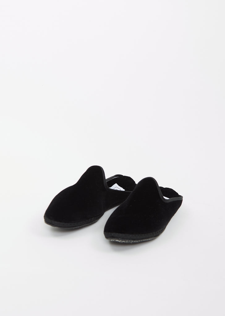 Drogheria Crivellini black mules with glove-like tight fit in lightweight velvet. Features a sustainably constructed rubber sole made from recycled bicycle tires with contrasting white stitching. Finished with tonal grosgrain trims.