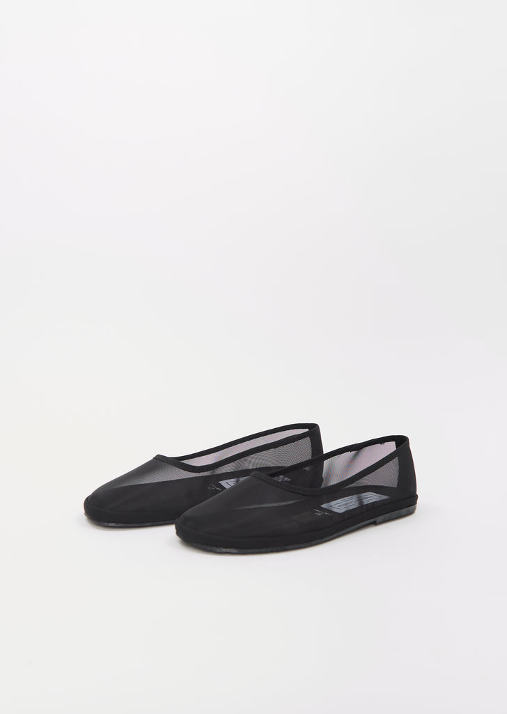 Drogheria Crivellini ballet flat with a round toe and tonal grosgrain trims in black mesh. Features a sustainably constructed rubber sole made from recycled bicycle tires with contrasting white stitching.