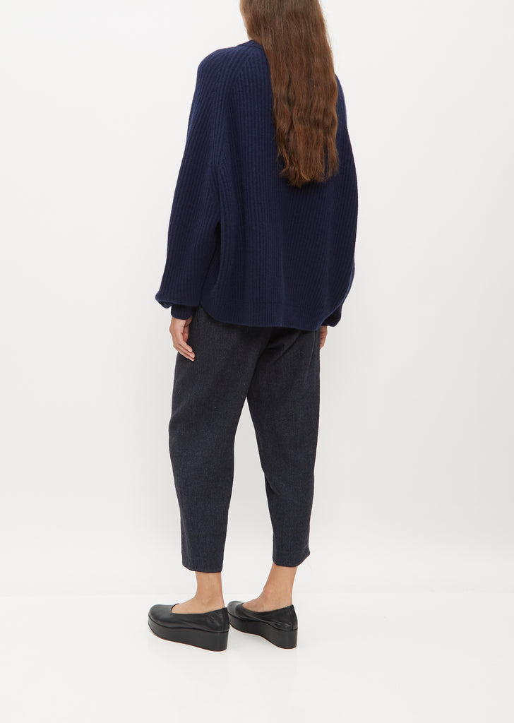 Brand Signature Piece — Dušan navy sweater with a relaxed silhouette knit in heavyweight pure ribbed cashmere. Features a round neckline, raglan shoulders, and ribbed trim finish.