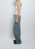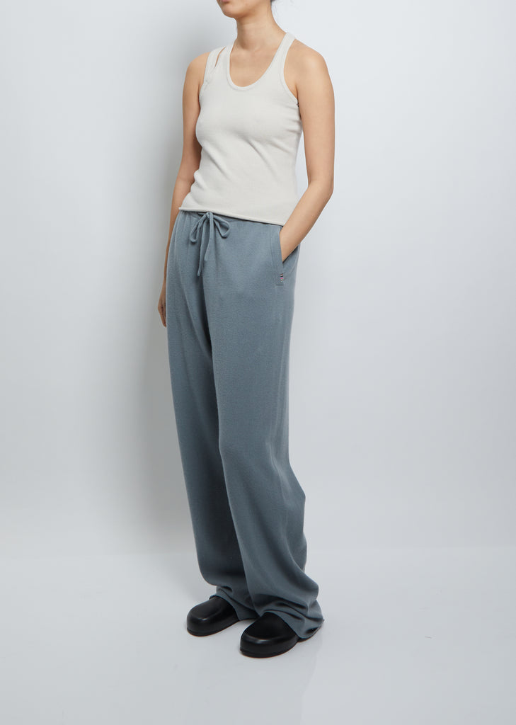 Extreme Cashmere sage blue pull-on knit trousers with a ribbed waistband in a stretch cashmere blend knit.