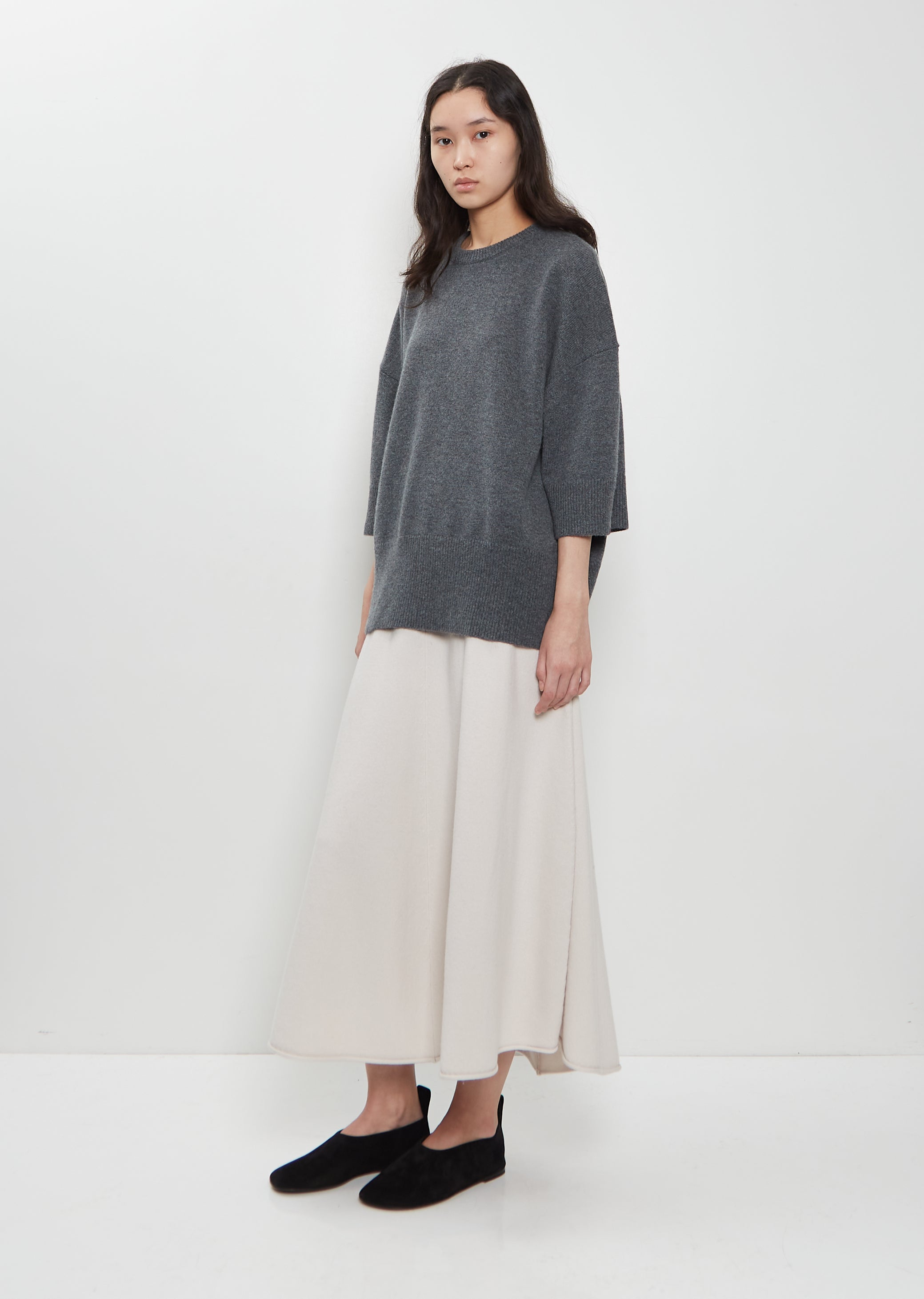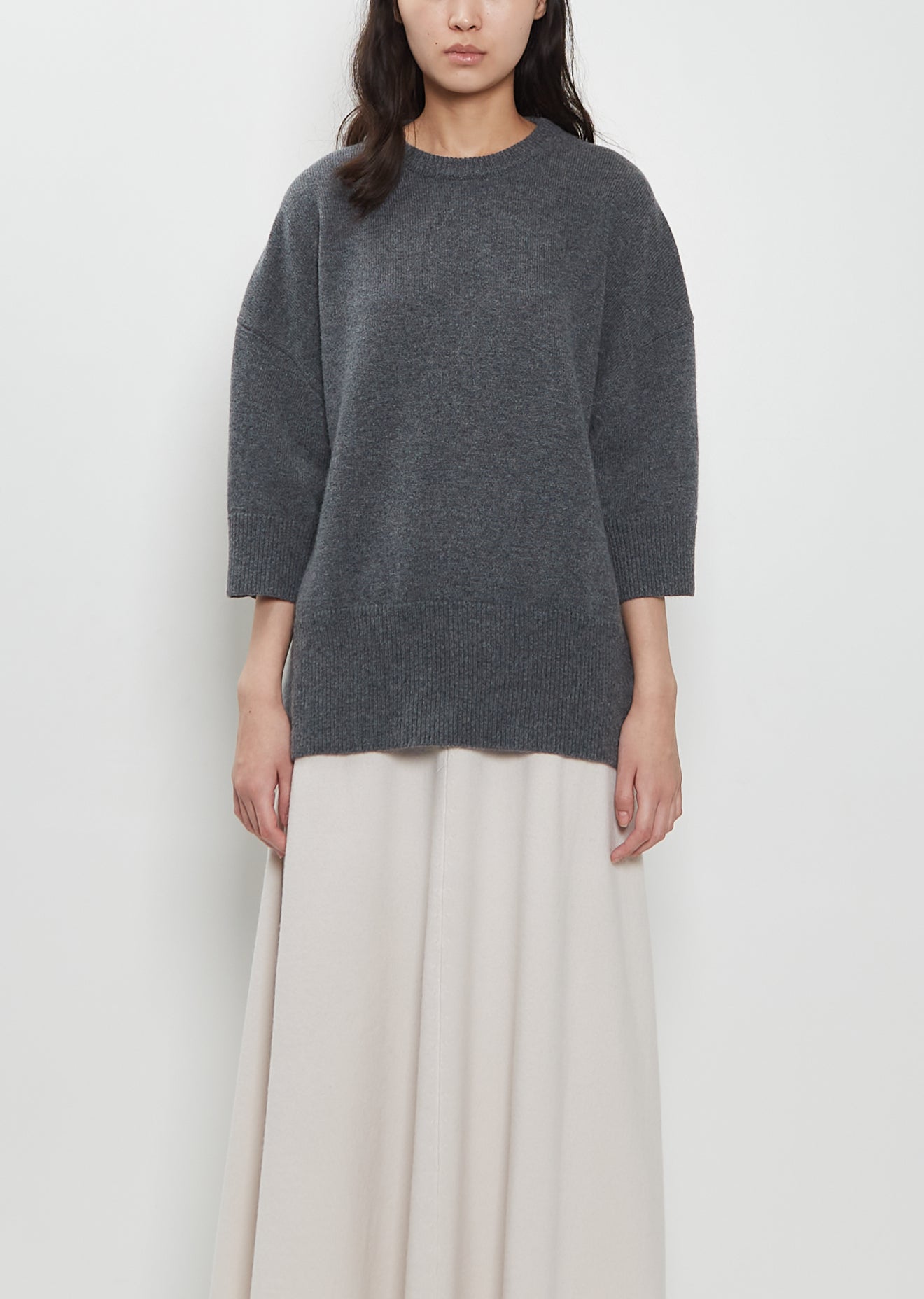 Extreme Cashmere felt grey sweater with a crew neckline and elbow length sleeves in a mid-weight cashmere knit. Features dropped shoulders and ribbed trim finish at neckline, cuffs, and hem. Relaxed fit.