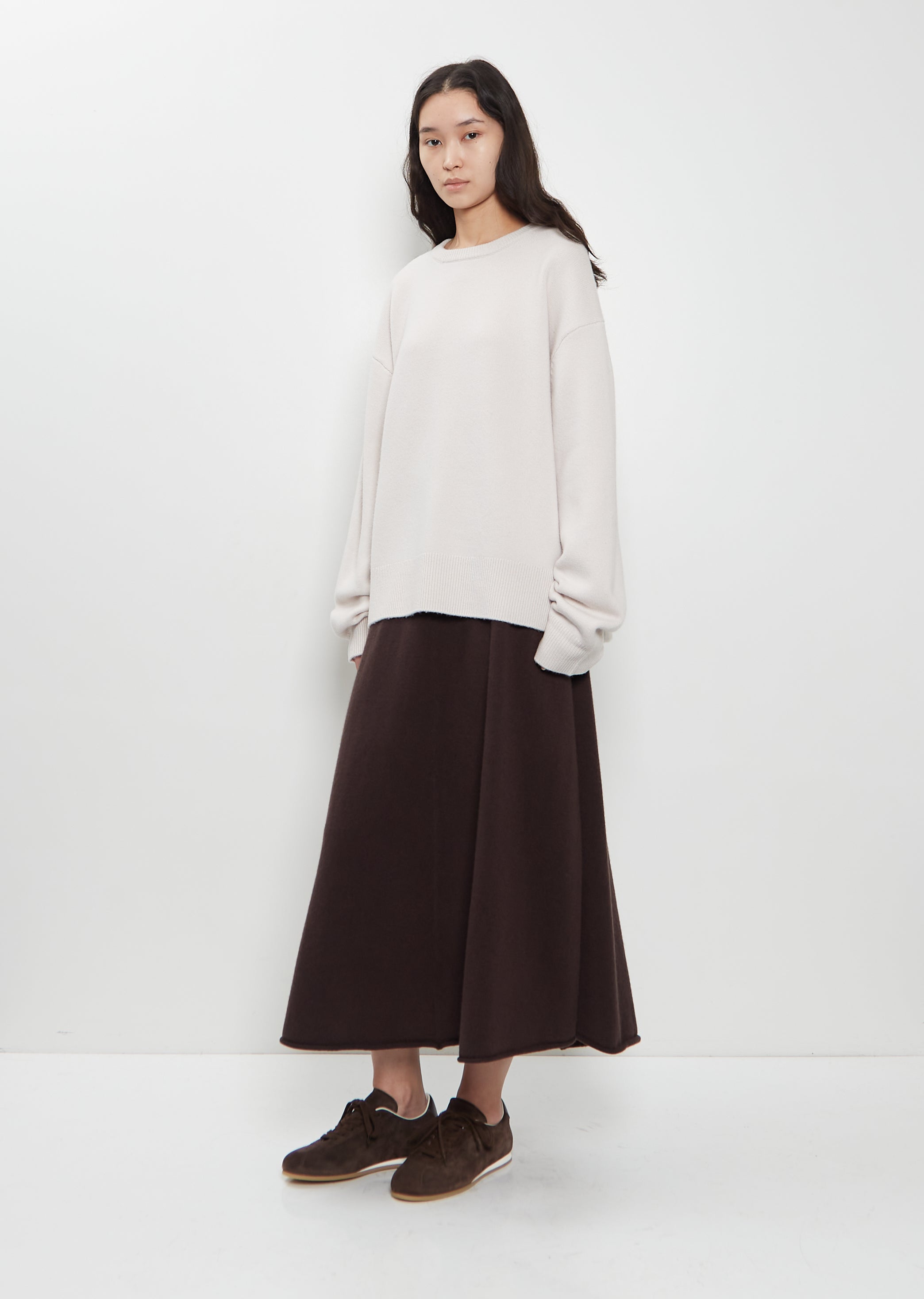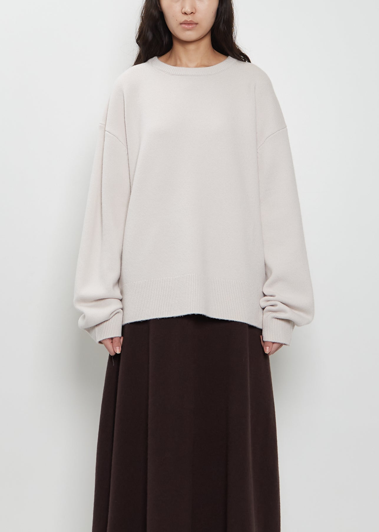 Extreme Cashmere chalk white sweater with a crew neckline and elongated sleeves in a mid-weight cashmere blend knit. Features dropped shoulders and ribbed trim finish at neckline, cuffs, and hem. Relaxed fit.