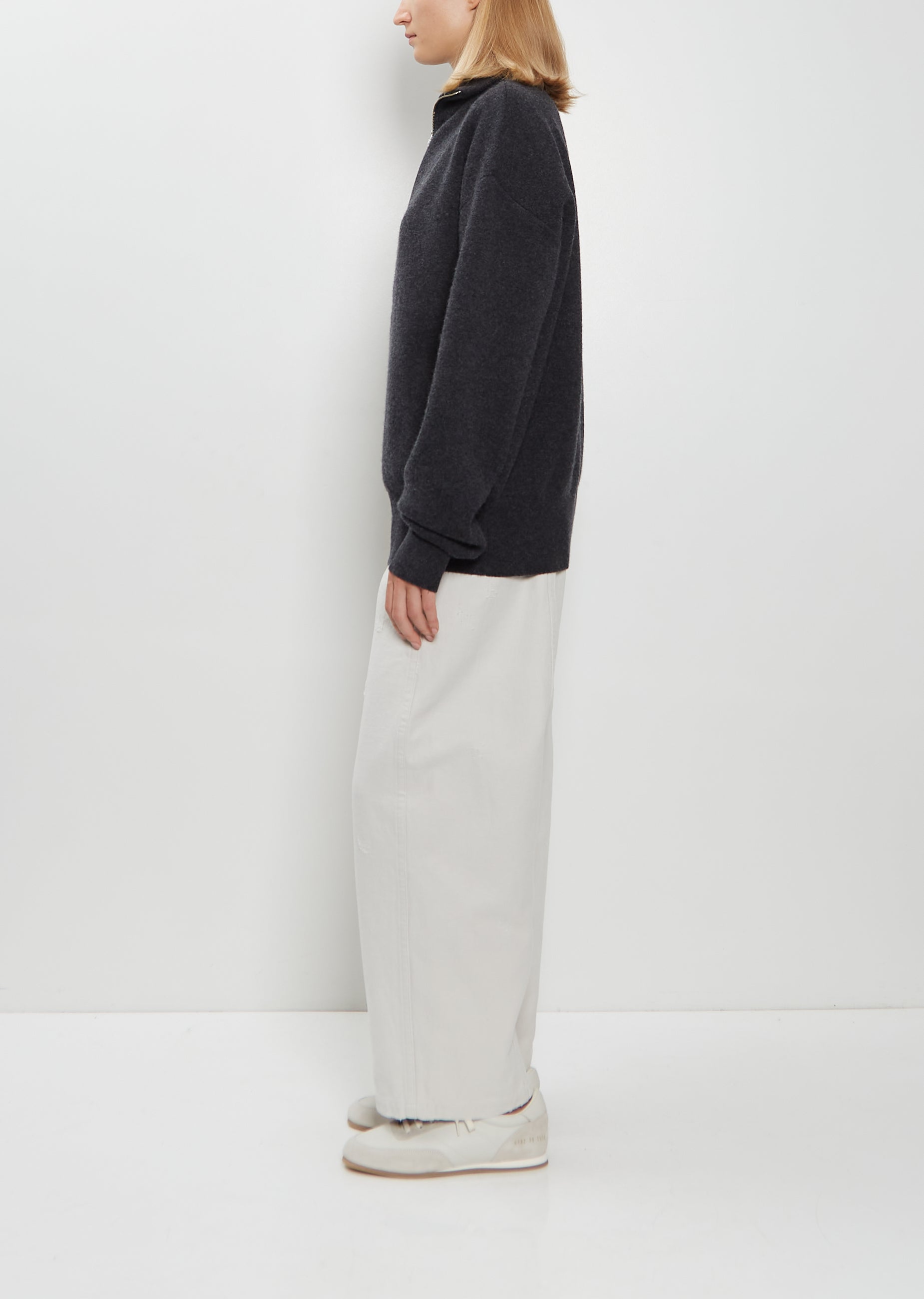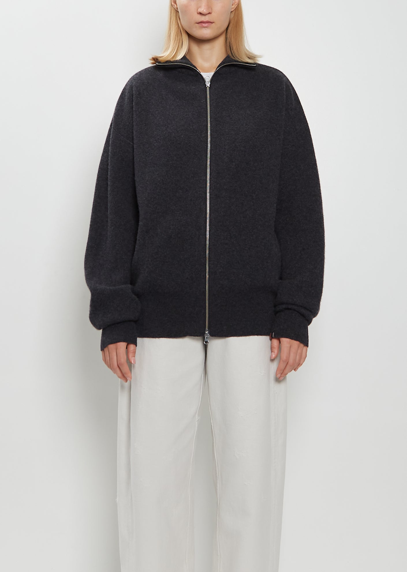 Extreme Cashmere shadow grey unisex two-way zip-up cardigan knitted in a tight gauge double-knit cashmere knit. Features drop shoulders, side pockets, and rib trim finish at neckline, cuffs, and hem. Boxy silhouette with an oversized fit.