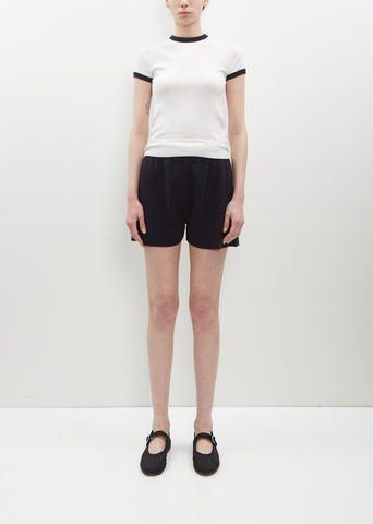 Extreme Cashmere navy pull on shorts in cotton and cashmere knit. Wide elasticated waistband and raw finish hems.