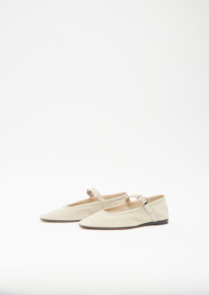 Le Monde Béryl light grey mary jane with an almond toe and piped trim in soft suede. Features a square-cut vamp, silver-tone buckle fastening, a cushioned calf leather insole, a leather sole and rubber heel.
