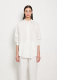Forte Forte white classic menswear inspired shirt with dropped shoulders in cotton poplin. Features button front closure with shell buttons, a pointed spread collar, and back pleat detail. Oversized fit.