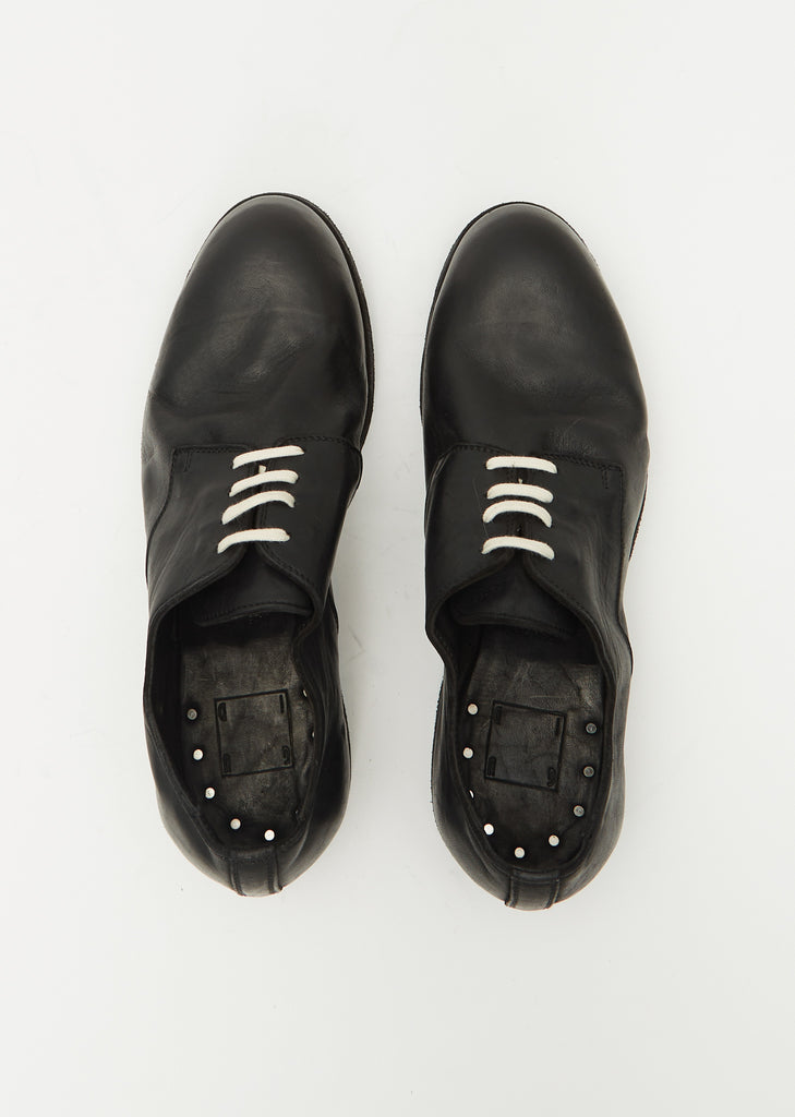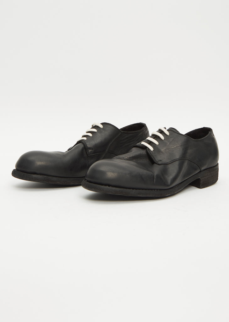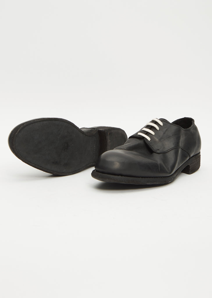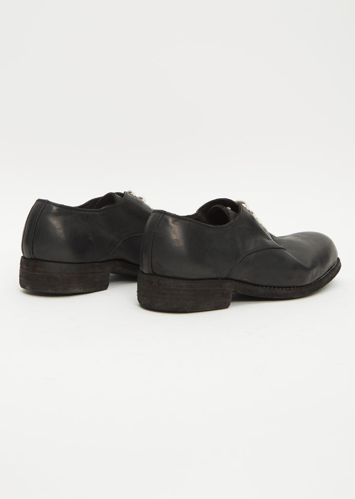 Guidi men's black vintage derby in full grained soft horse leather with a stacked leather heel and tonal topstitching. Fully lined in leather.