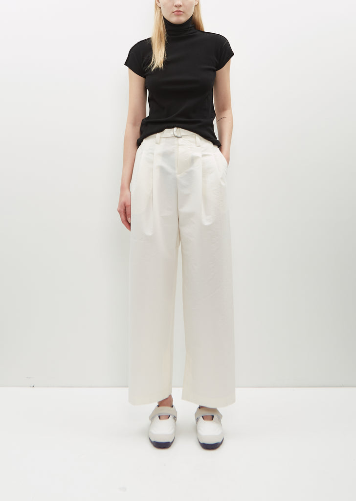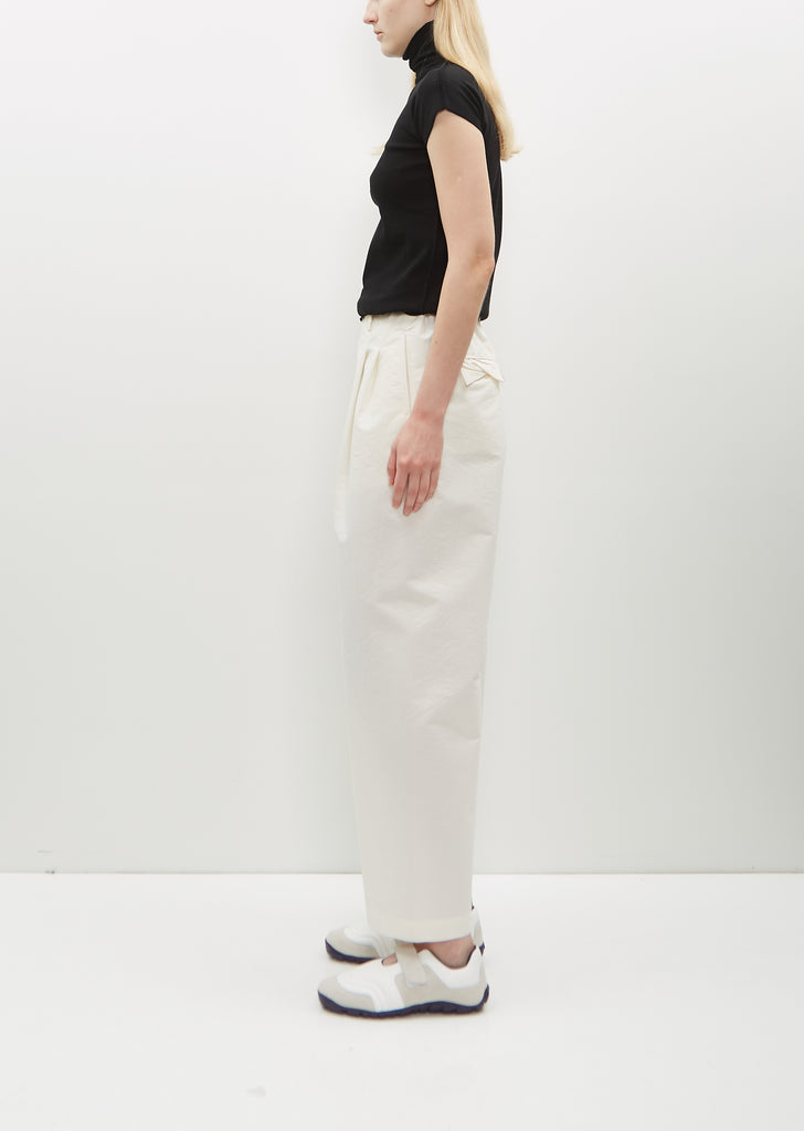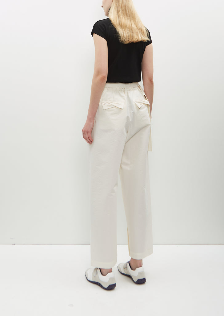 Issey Miyake off-white high waisted pleated pants with straight, wide legs and elasticated back in a cotton blend. Features slash sides pockets and welt back pockets with unique origami fold detailing. Button through with zip-fly fastening.