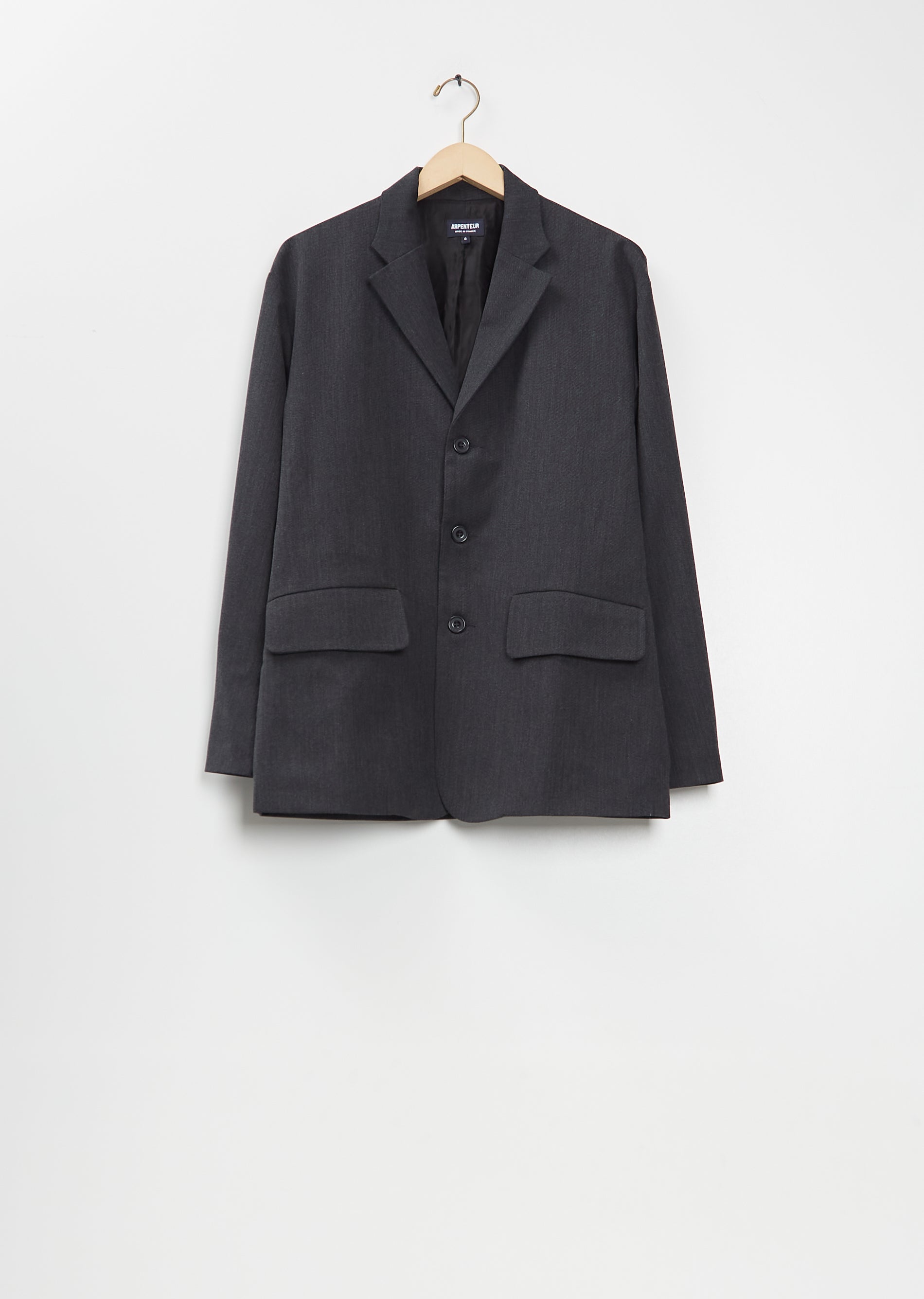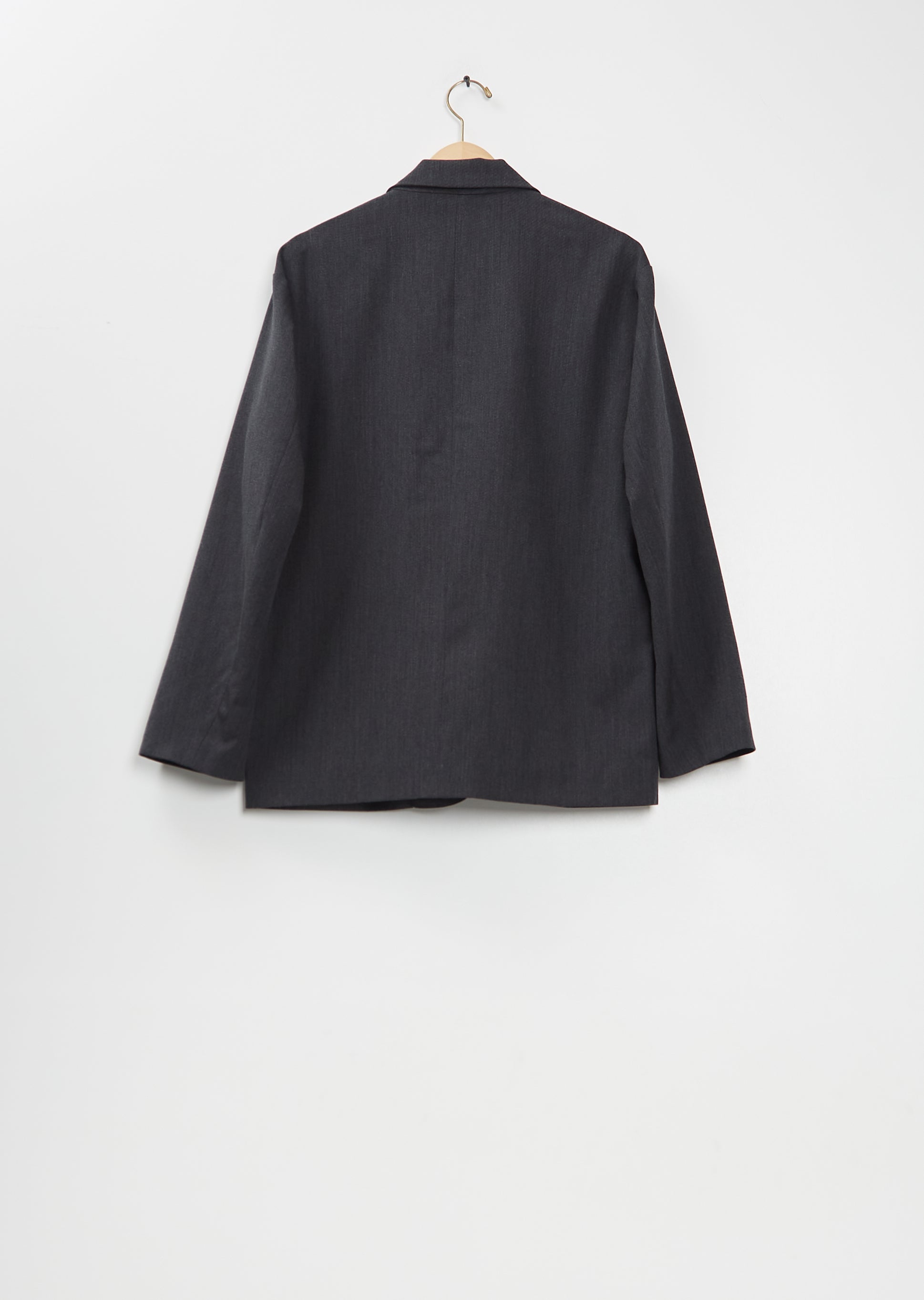 Arpenteur charcoal grey blazer with notched lapels and flap pockets in soft and lightweight wool. Features slightly dropped shoulders shoulders, clean sleeves, tonal buttons closure at front and a curved hem. Fully lined in black cupro fabric. Relaxed fit.