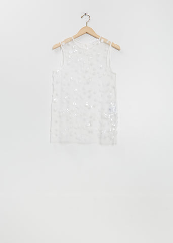 Cecilie Bahnsen white sleeveless top with a round neckline in an embroidered sequin blossom tulle. Features a tie fastening at back neck.