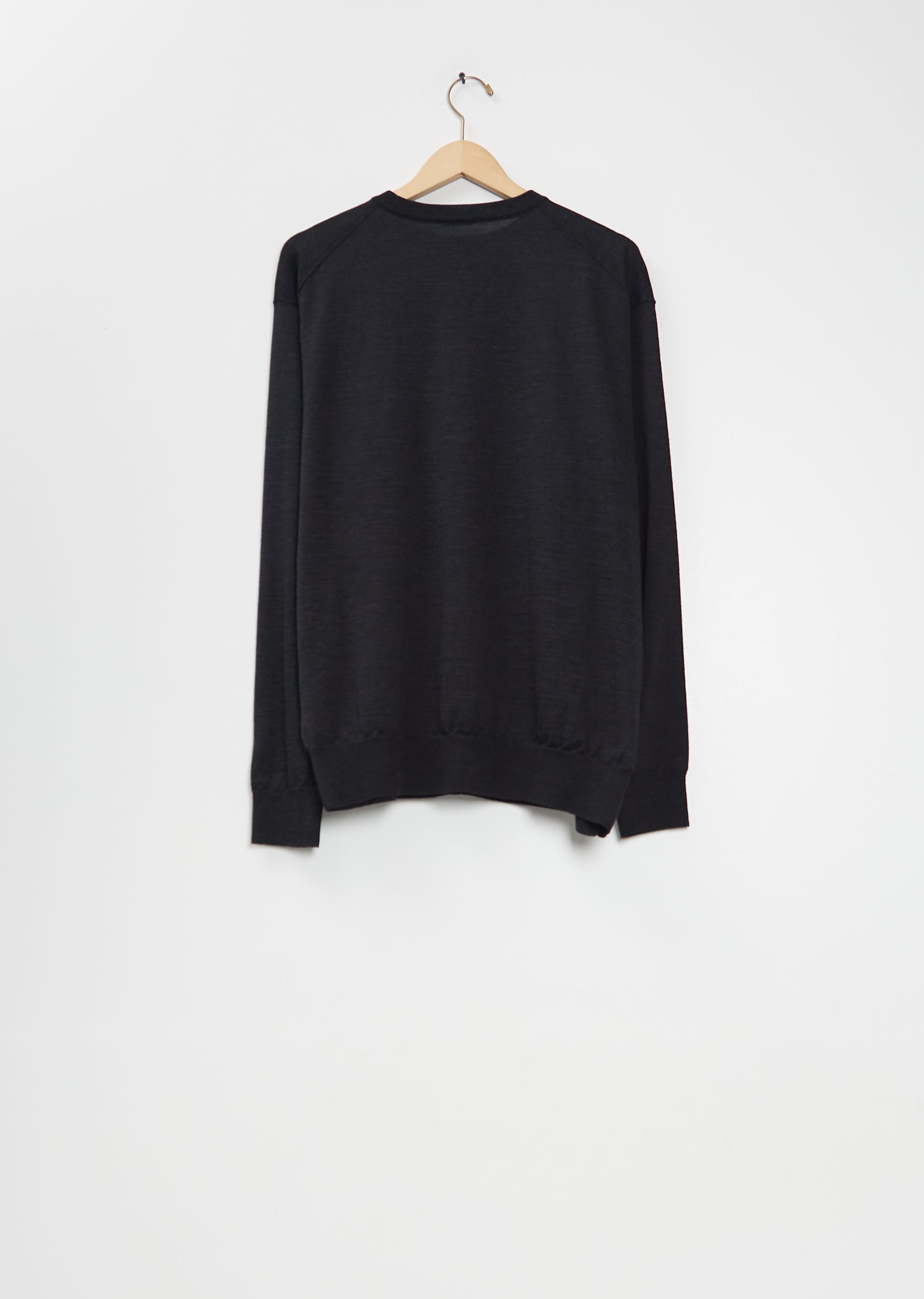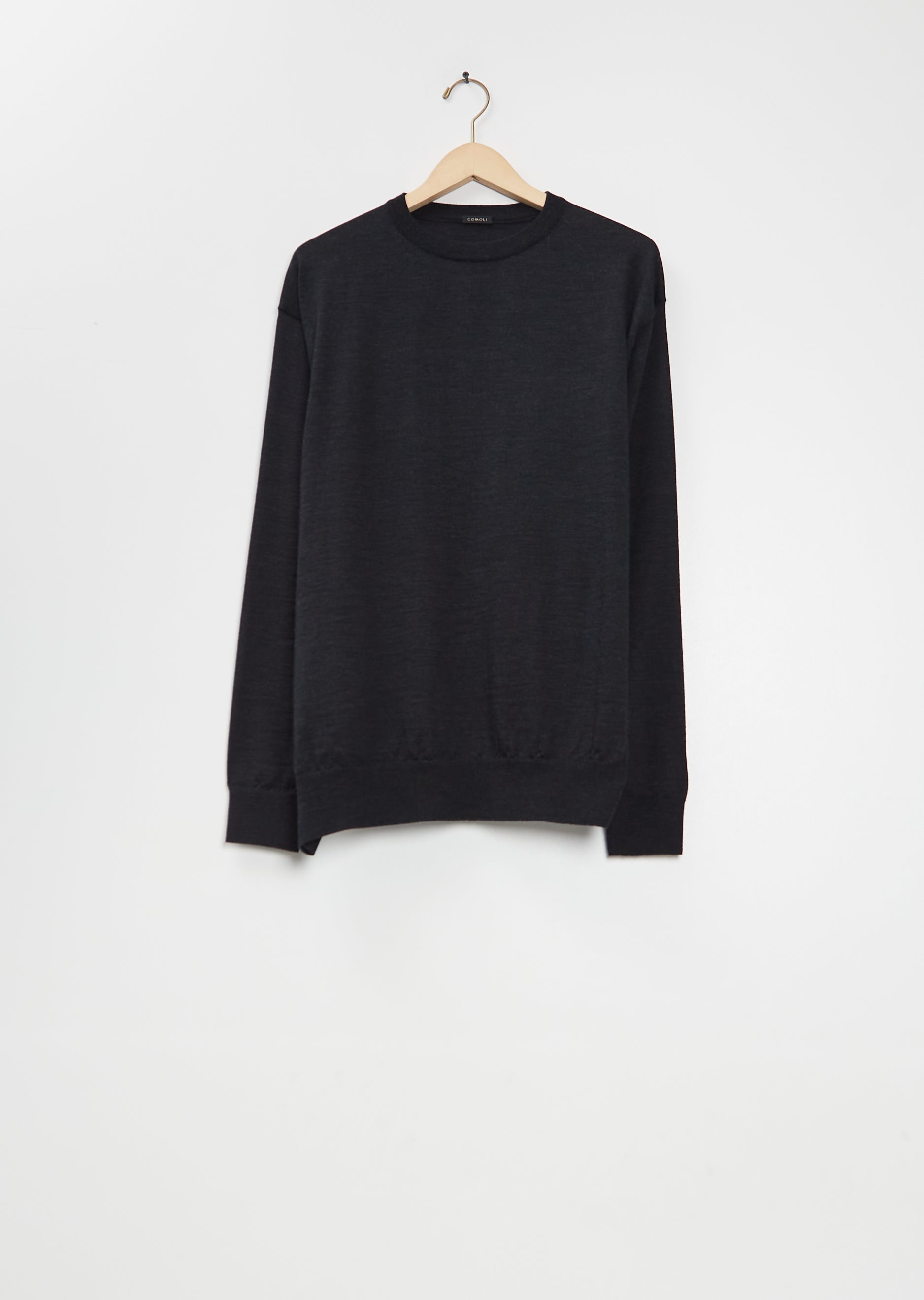 Comoli charcoal sweater with a crew neckline and dropped shoulders in a wool knit. Features ribbed trim finish at neckline, cuffs, and hem. Relaxed fit.