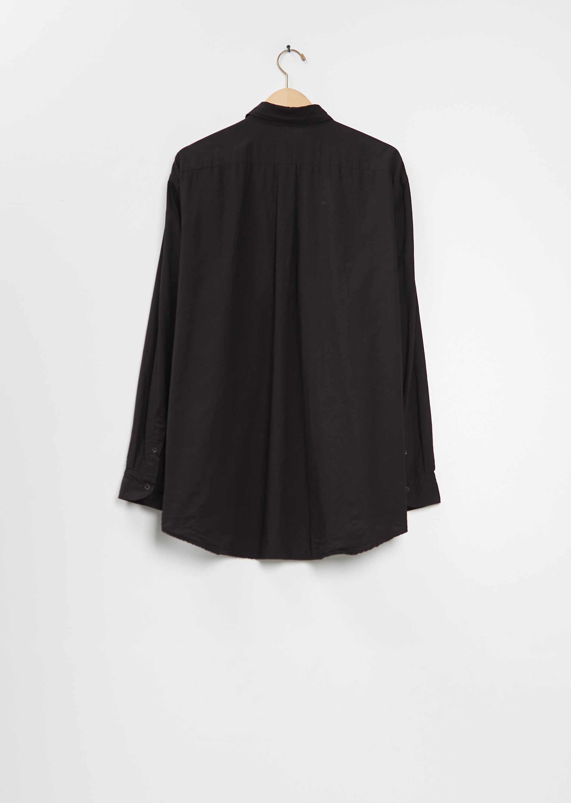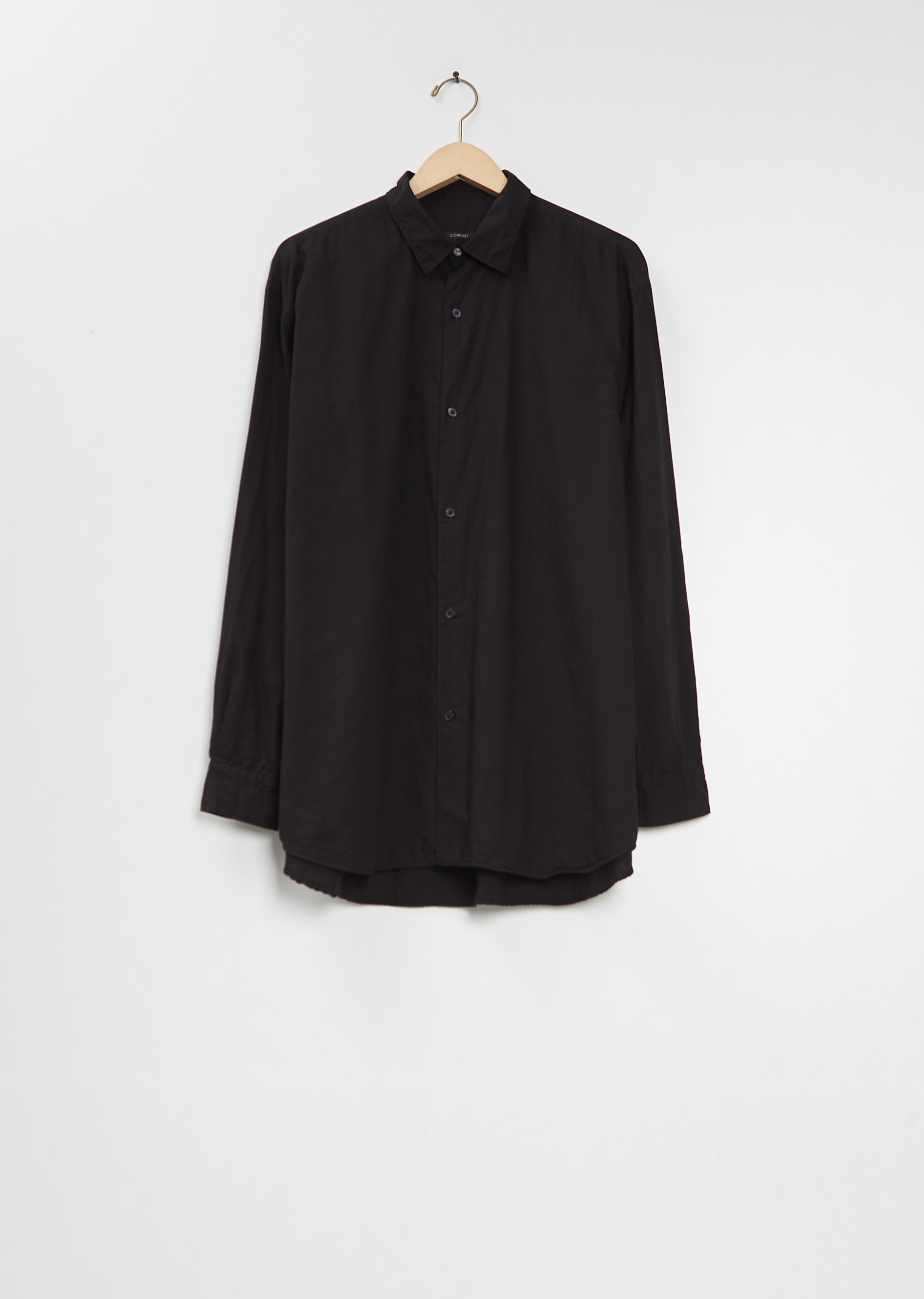 Comoli black shirt with a classic collar and tonal button front in double layer khadi cotton. Features dropped shoulders, buttoned cuffs, curved hem, and box pleat at back yoke.