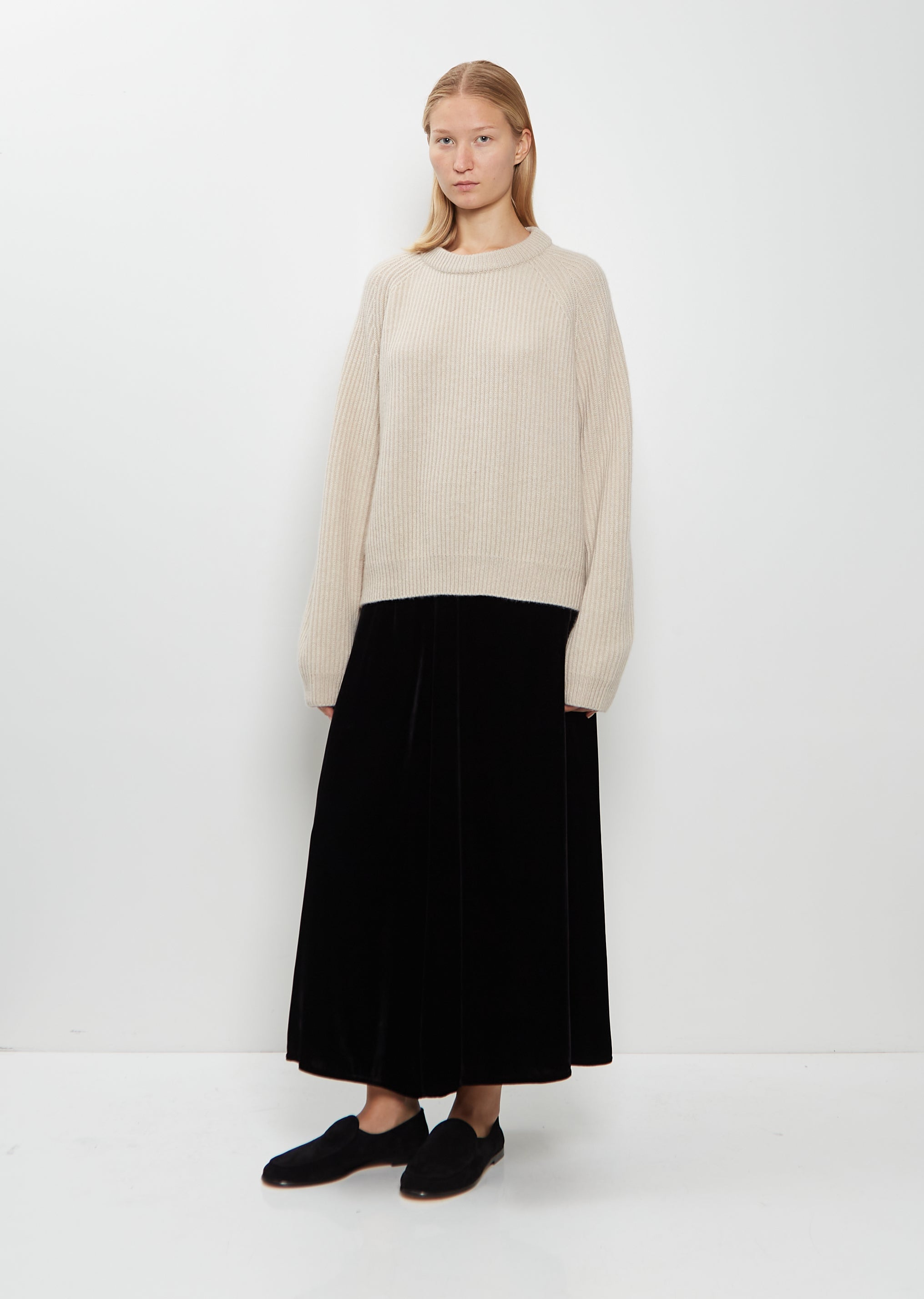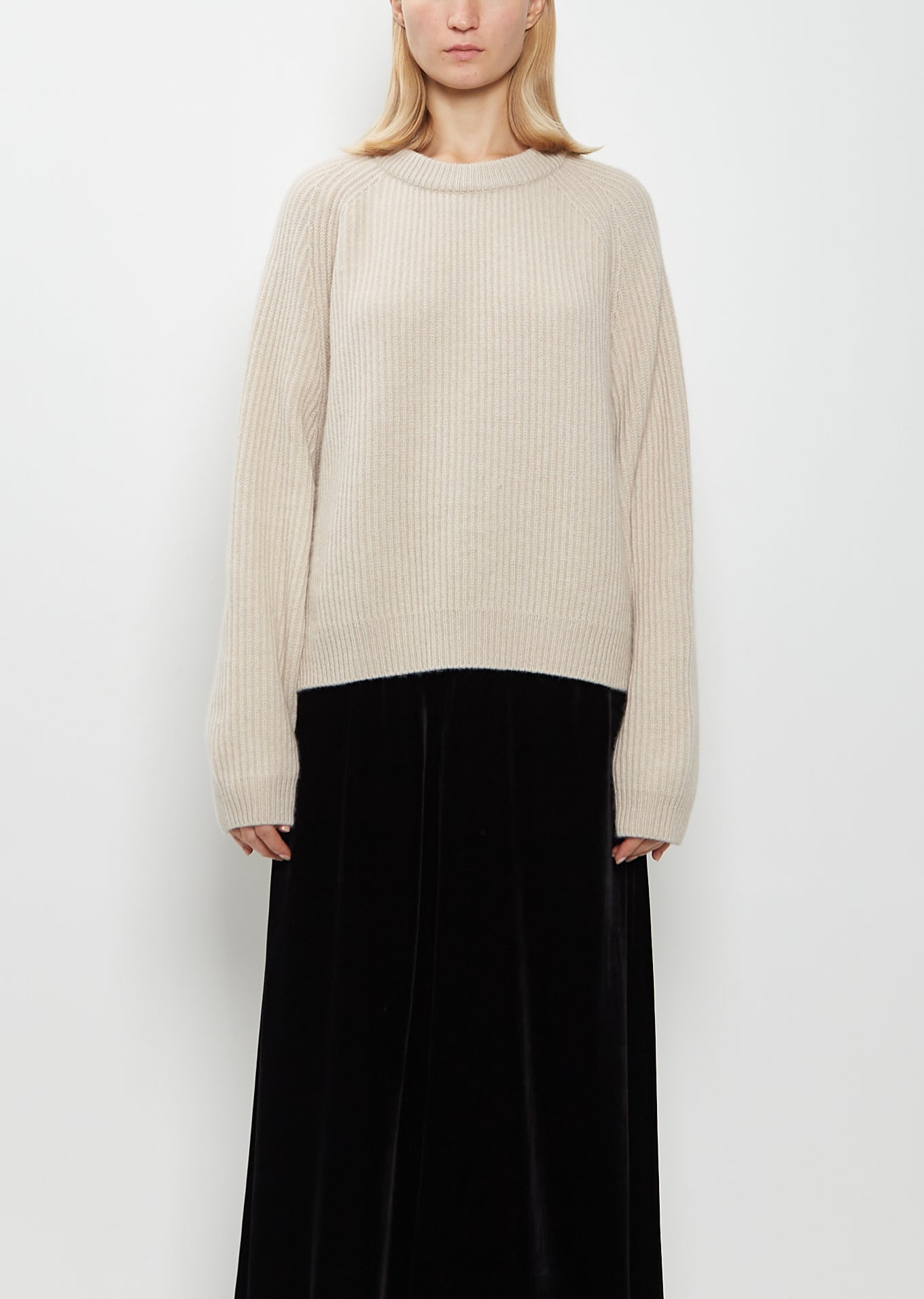 Crew Neck Ribbed Raglan Cashmere Sweater — Oatmeal