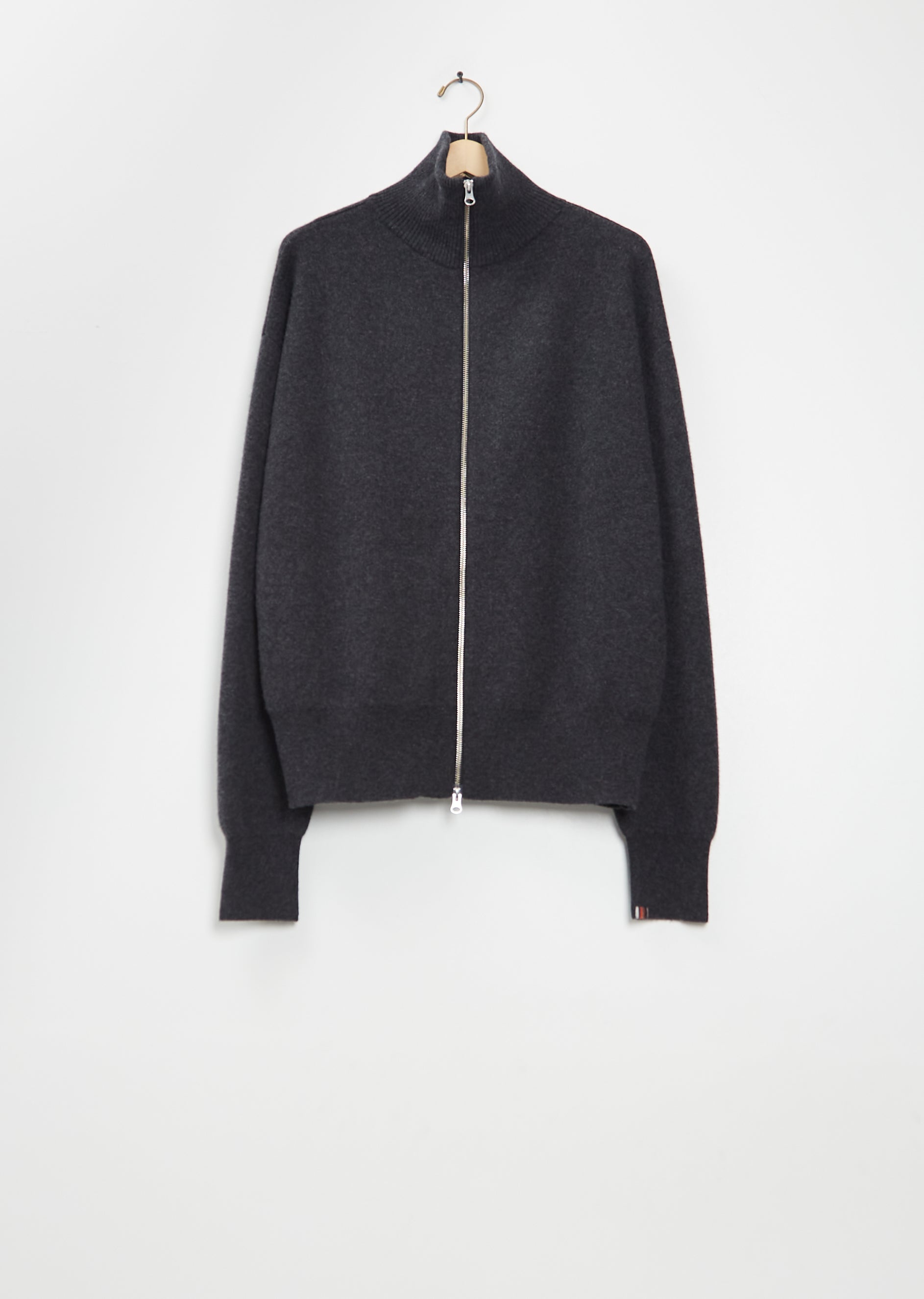Extreme Cashmere shadow grey unisex two-way zip-up cardigan knitted in a tight gauge double-knit cashmere knit. Features drop shoulders, side pockets, and rib trim finish at neckline, cuffs, and hem. Boxy silhouette with an oversized fit.