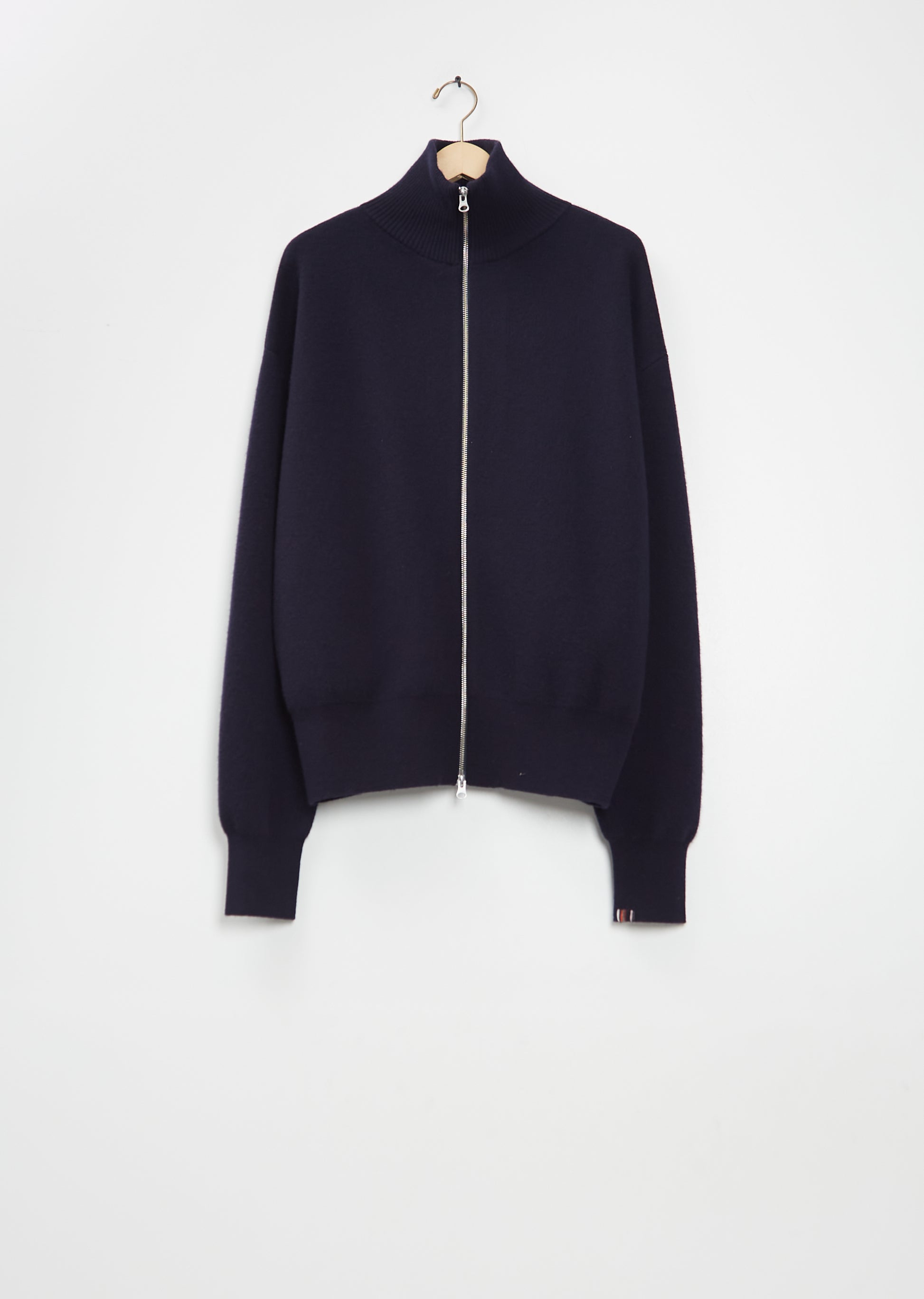 Extreme Cashmere navy unisex two-way zip-up cardigan knitted in a tight gauge double-knit cashmere knit. Features drop shoulders, side pockets, and rib trim finish at neckline, cuffs, and hem. Boxy silhouette with an oversized fit.