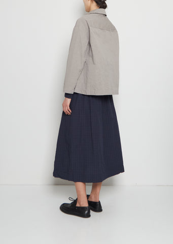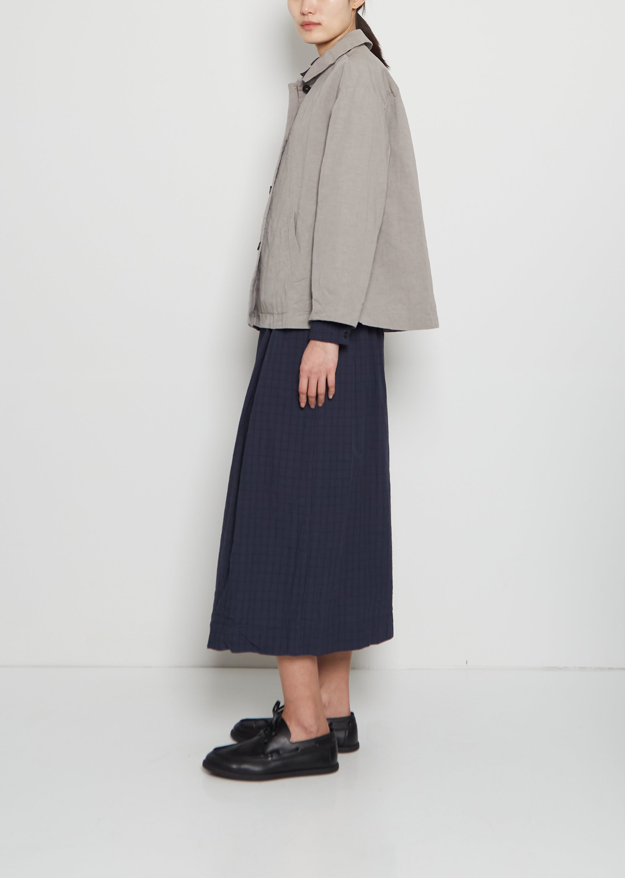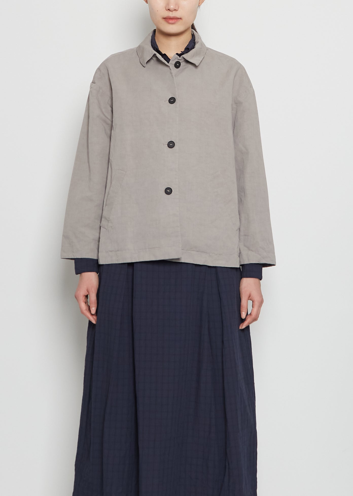 Bergfabel mink grey utilitarian-inspired A-line jacket with a spread collar and angled side pockets in crisp and lightweight cotton and linen blend. Features a contrasting buttons closure at front and a back yoke. Lined in self.