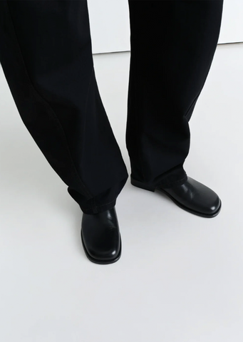 Lemaire black slip-on show with a rounded toe crafted in a single piece of smooth and glossy buffalo leather. Features a hand-painted leather sole and a tonal square stacked heel.